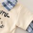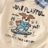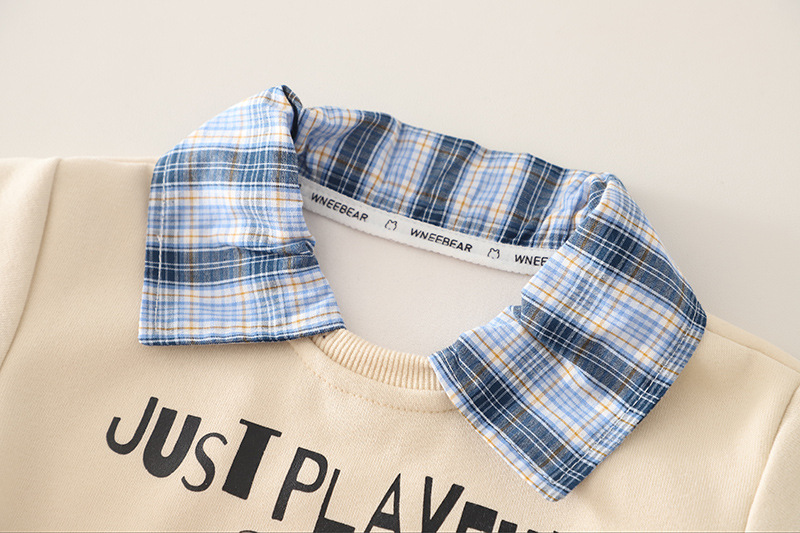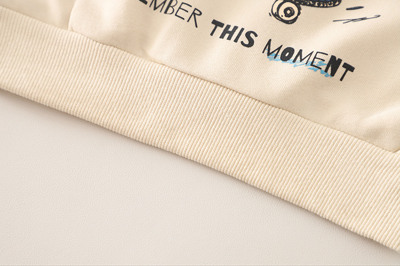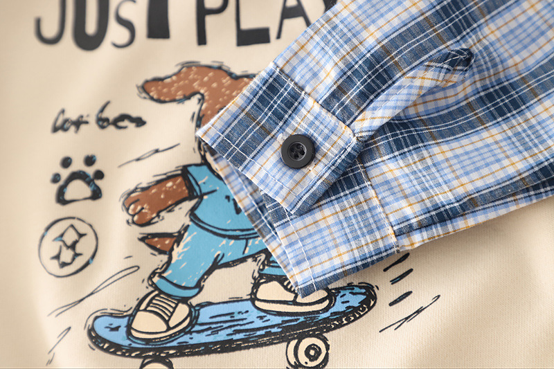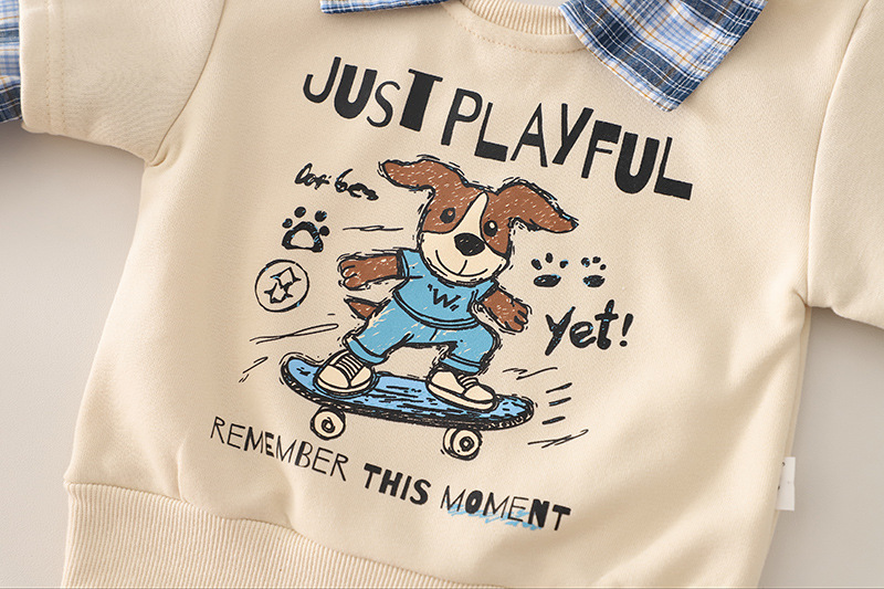 – Bluziță tip sweatshirt cu efect „2 în 1”, confecționată din material din bumbac de culoare crem. Modelul are mânecă scurtă, sub care este cusută o cămașă cu mânecă lungă și guler clasic în carouri albastre, creând un aspect modern și ordonat fără straturi suplimentare. În partea din față este decorată cu o imprimeu vesel cu un cățeluș pe skateboard și un text care adaugă un caracter jucăuș și copilăresc setului.