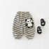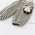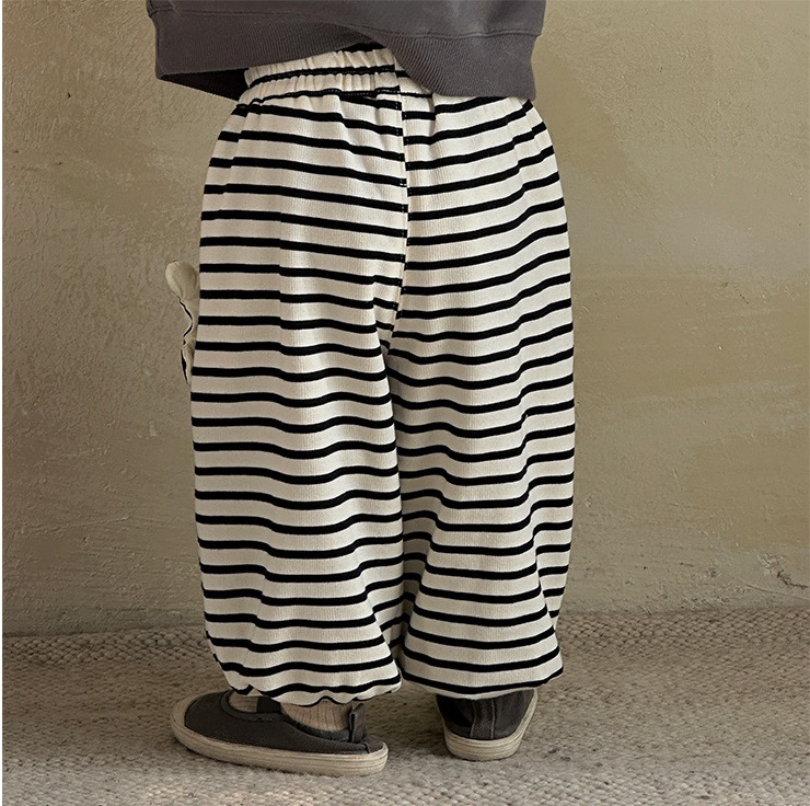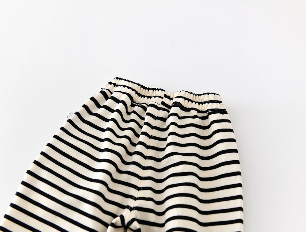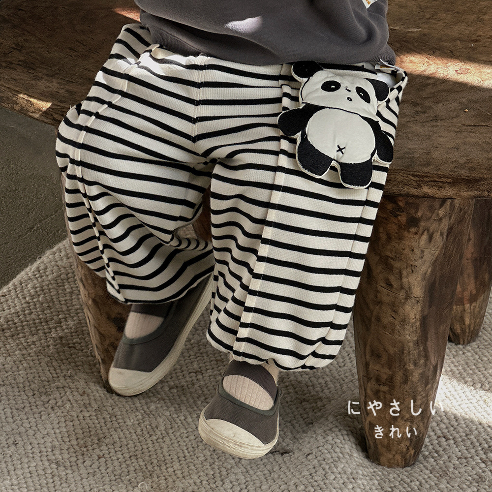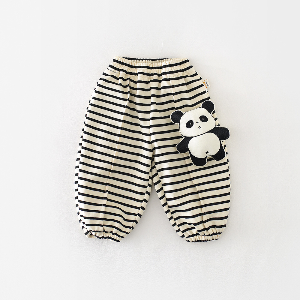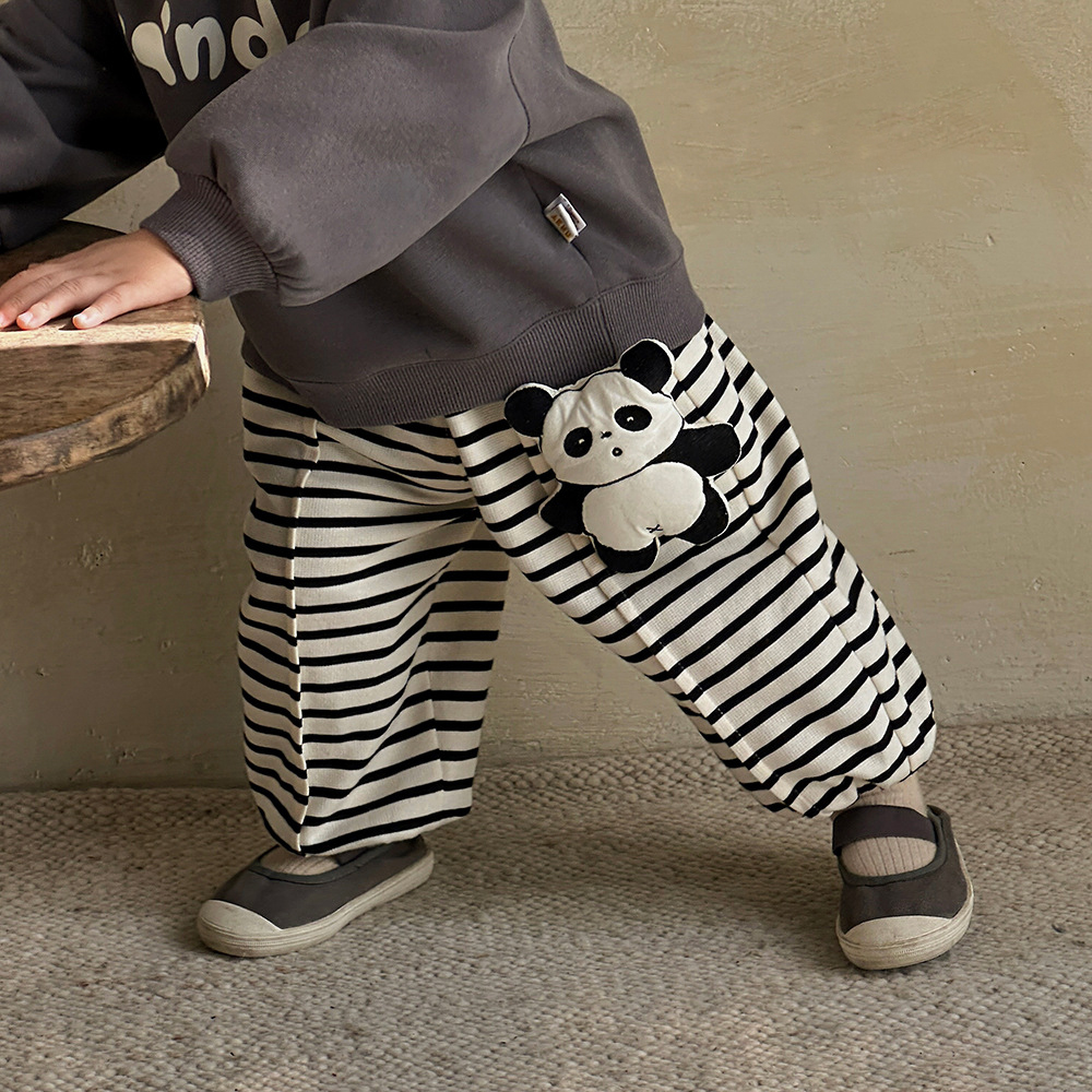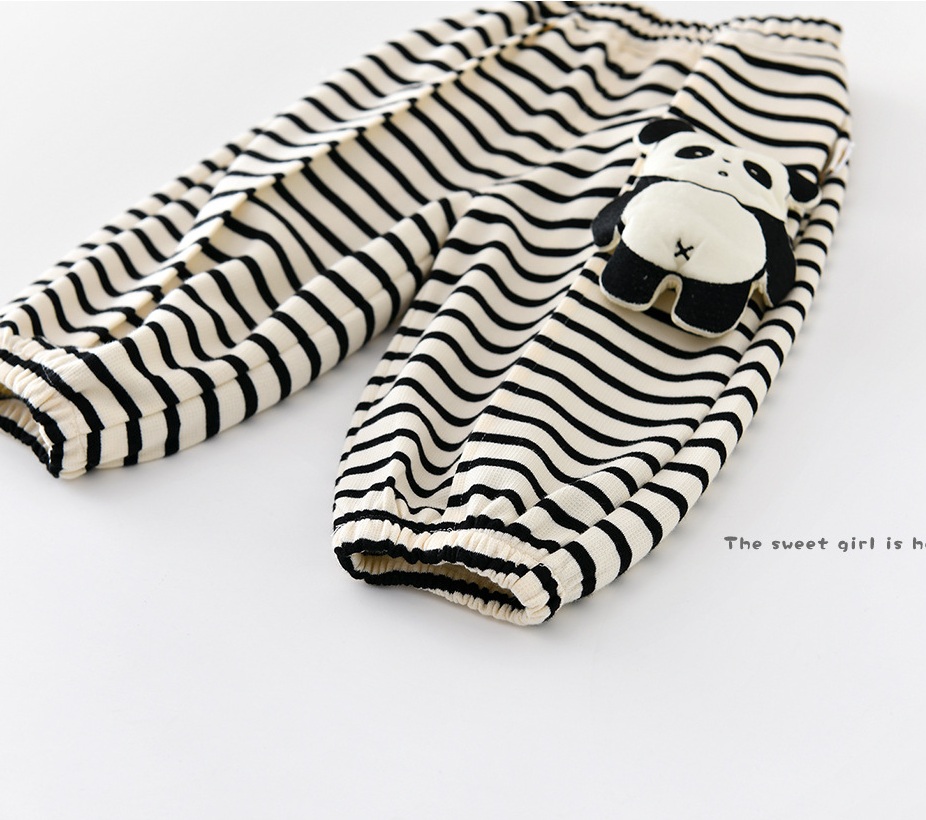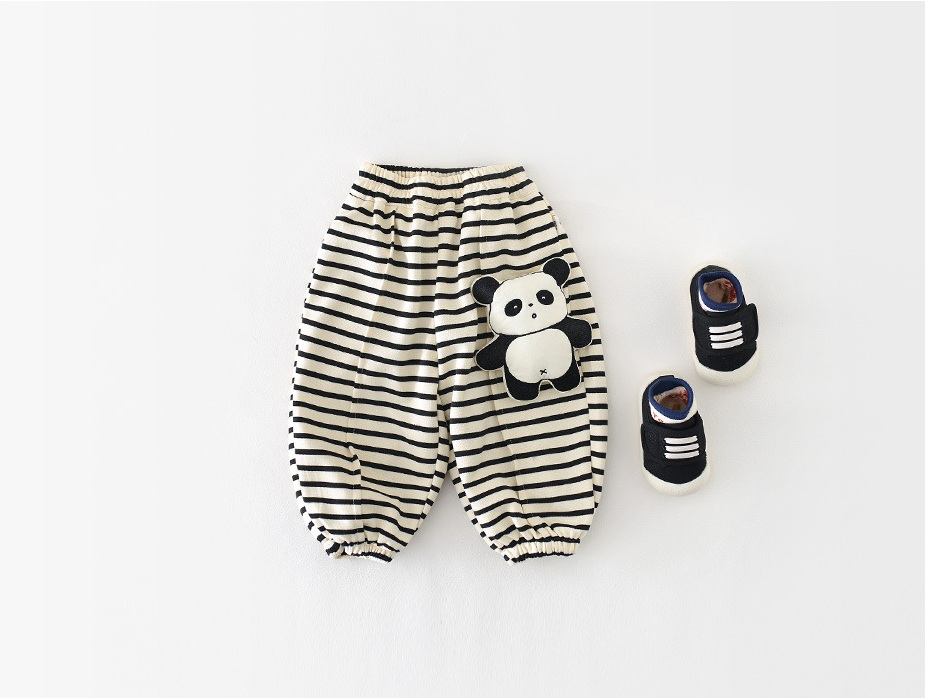– Pantalon cu croială lejeră, confecționat din material moale și elastic, în culoare crem cu dungi negre. Modelul are talie elastică și manșete elastice în partea de jos pentru o potrivire bună. Principalul accent este aplicația 3D cu ursuleț pe lateral – un detaliu moale și amuzant care îi bucură pe micii exploratori.