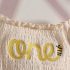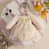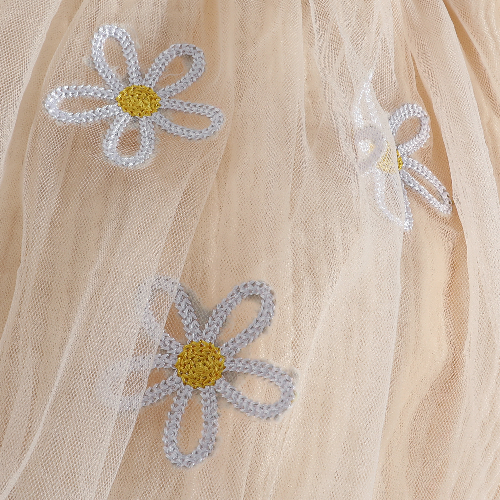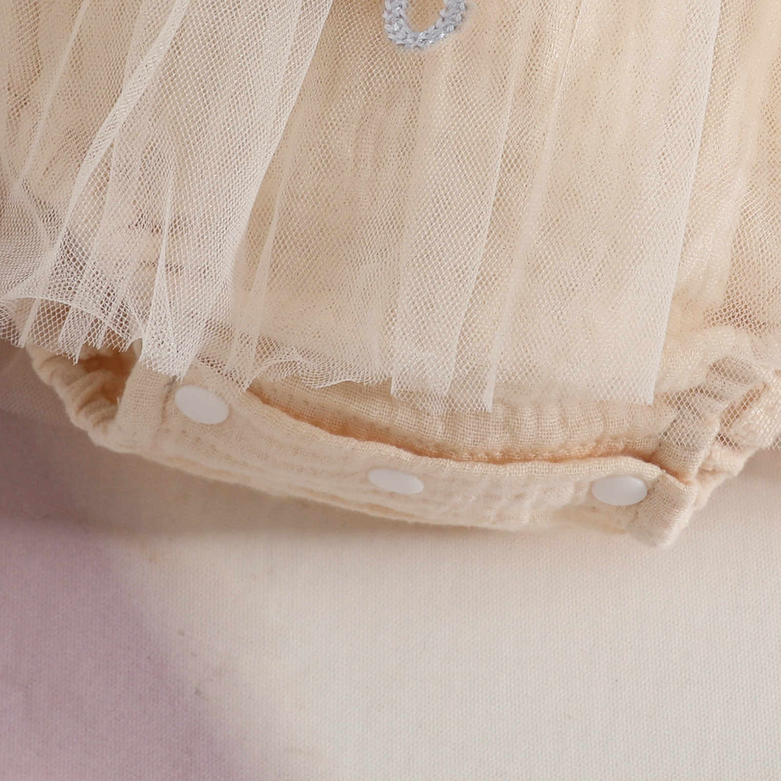 – Body-rochiță cu mânecă lungă și fustă vaporoasă din tul. Partea superioară este realizată din muselină moale, într-o nuanță delicată de nude, cu efect elastic și broderie galbenă cu inscripție – un accent perfect pentru orice zi specială. Fusta este din tul moale și pufos, decorată cu margarete brodate, care adaugă o notă romantică și creează o imagine de basm.