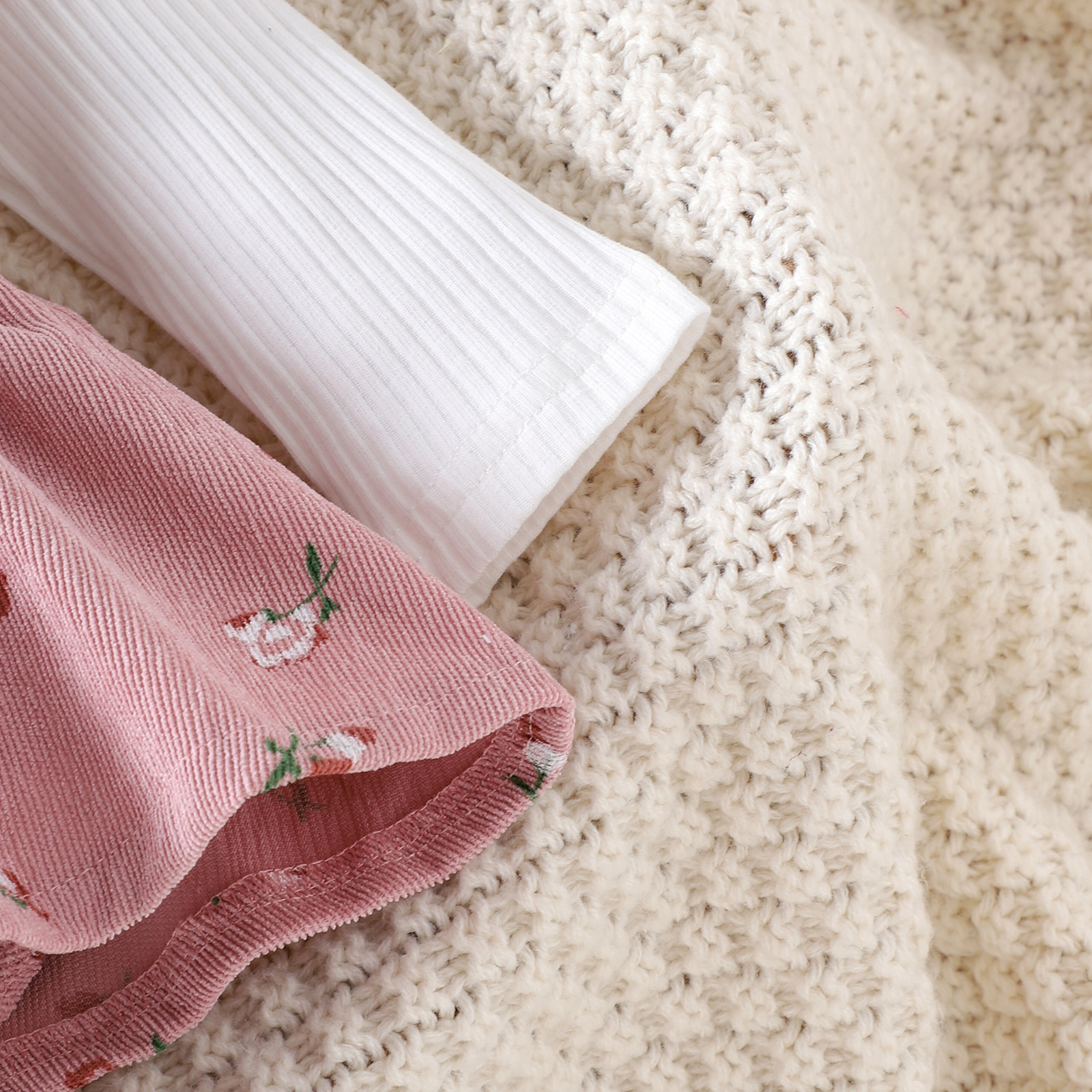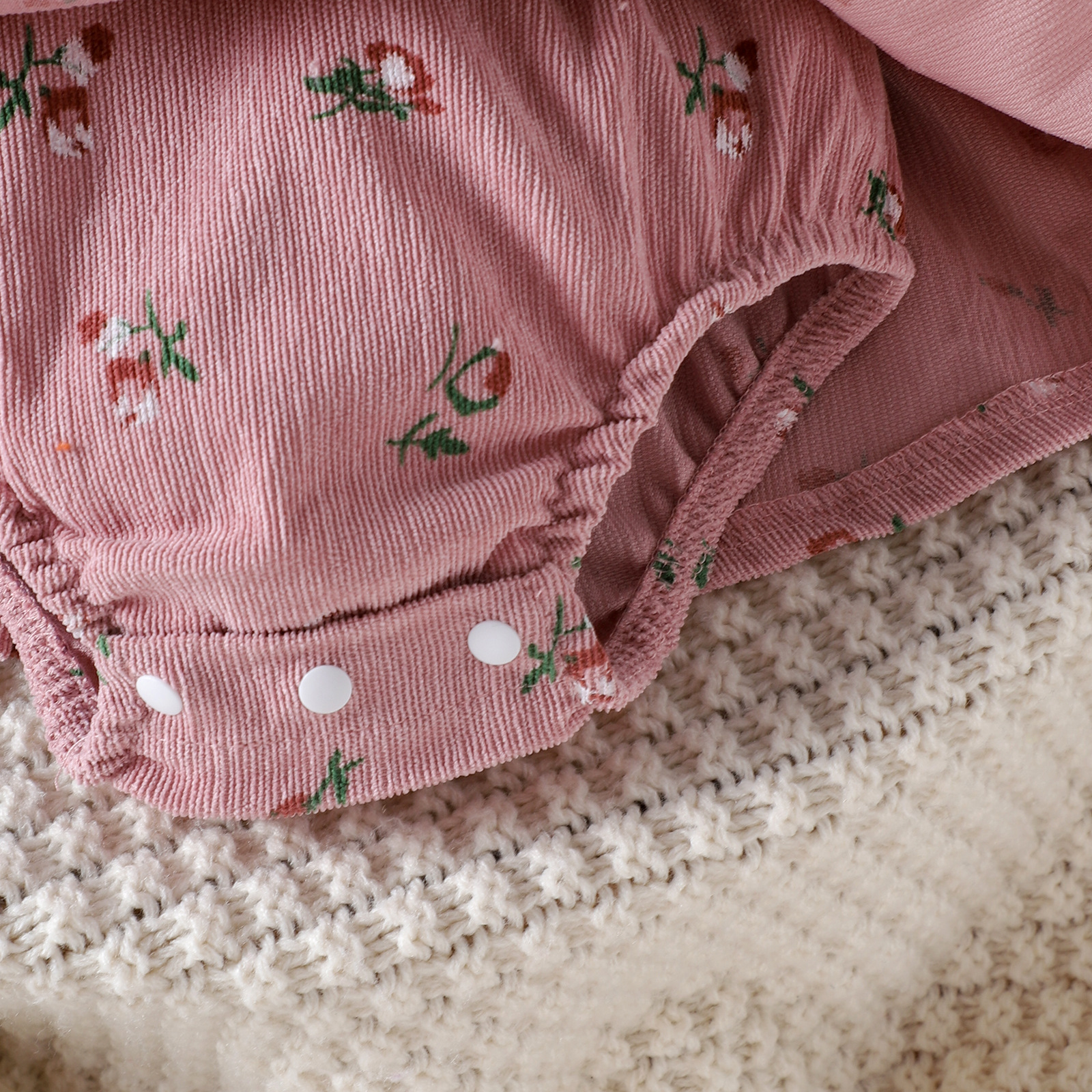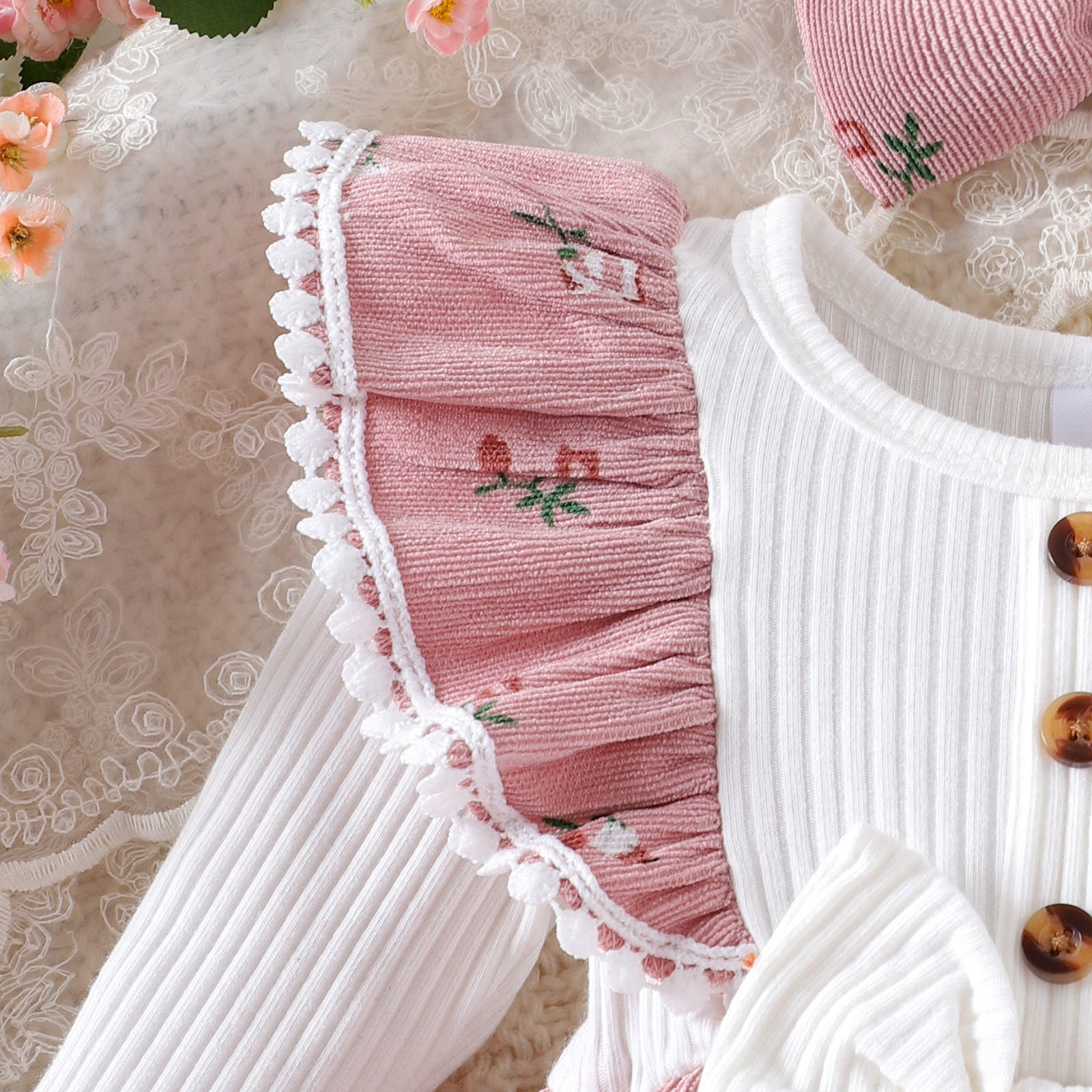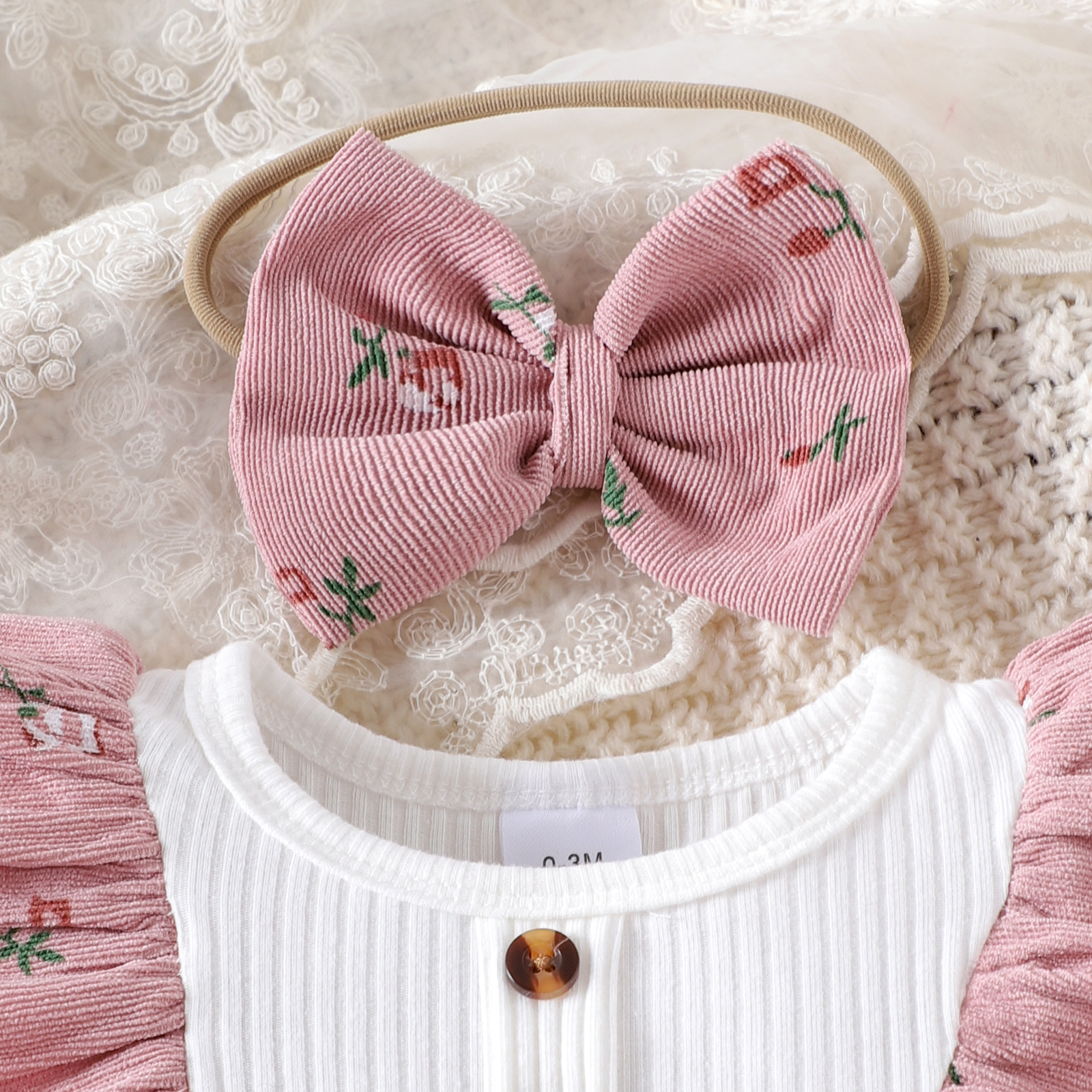 – Body/rochiță confecționată din material tricotat rib de înaltă calitate în partea superioară și denim fin cu imprimeu floral în nuanță roz pudrat. Modelul este decorat cu volănașe cu bordură din dantelă pe umeri și o fundă mare în față, care oferă o notă elegantă. Închiderea cu capse în partea de jos facilitează îmbrăcarea.