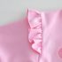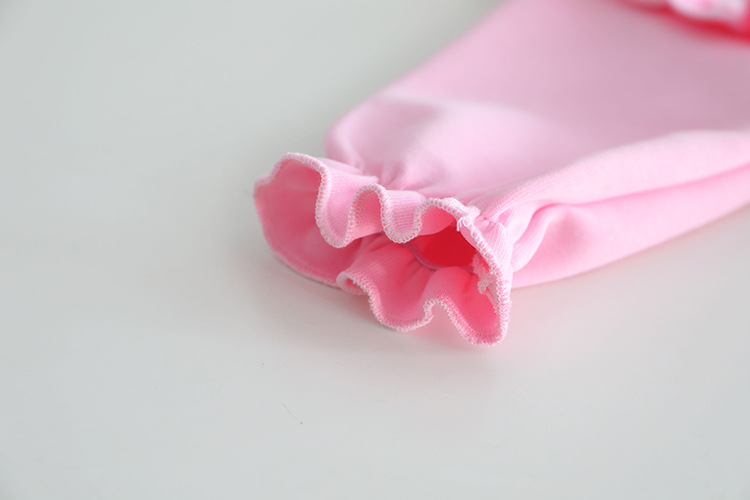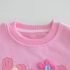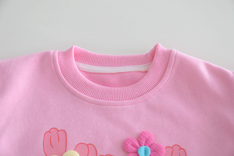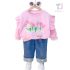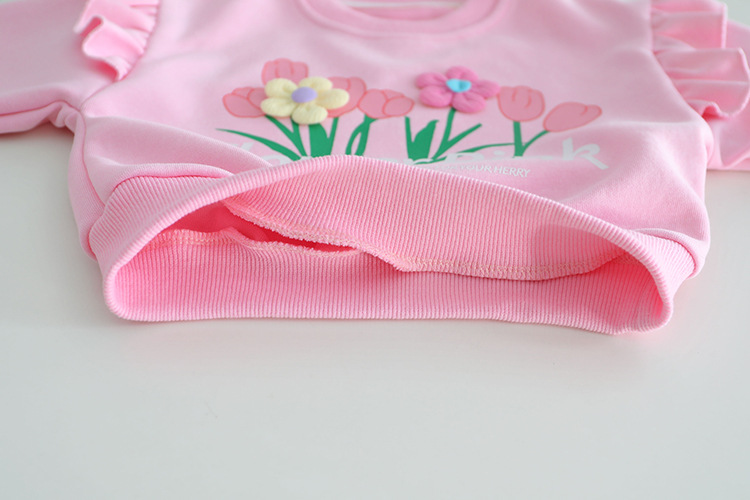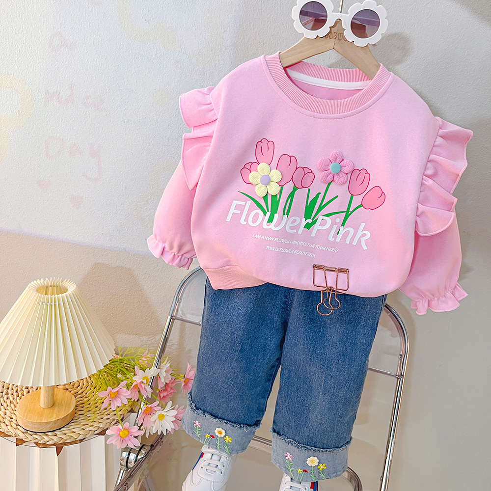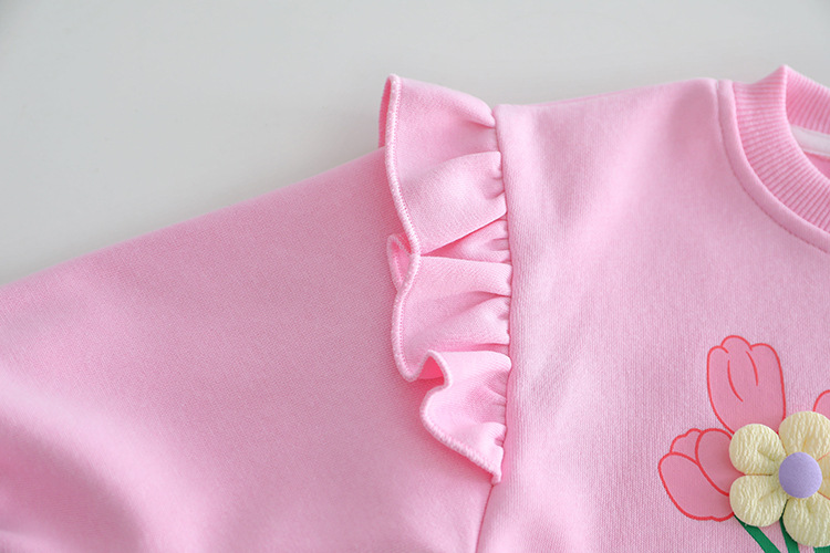 – Bluză cu mânecă lungă, din material moale, de culoare roz. Model cu volane “fluture” în jurul umerilor, care evidențiază aspectul, elemente 3D și imprimeu cu flori în partea din față.