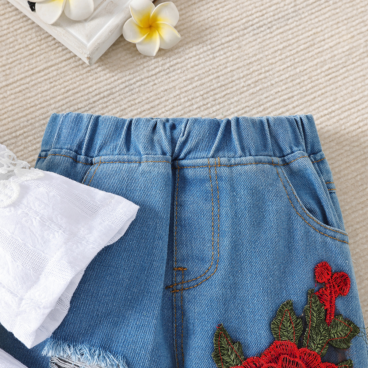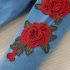 -Pantaloni din denim, cu talie elastică pentru confort, buzunare laterale și trandafiri roșii 3D aplicați asimetric pe un crac. Tivurile sunt ușor franjurate pentru un look relaxat.
