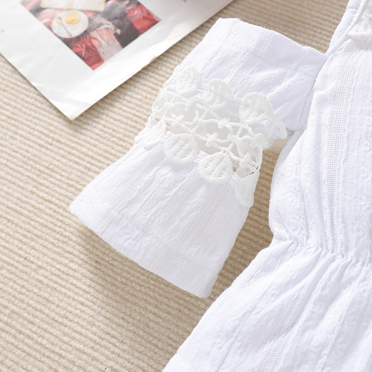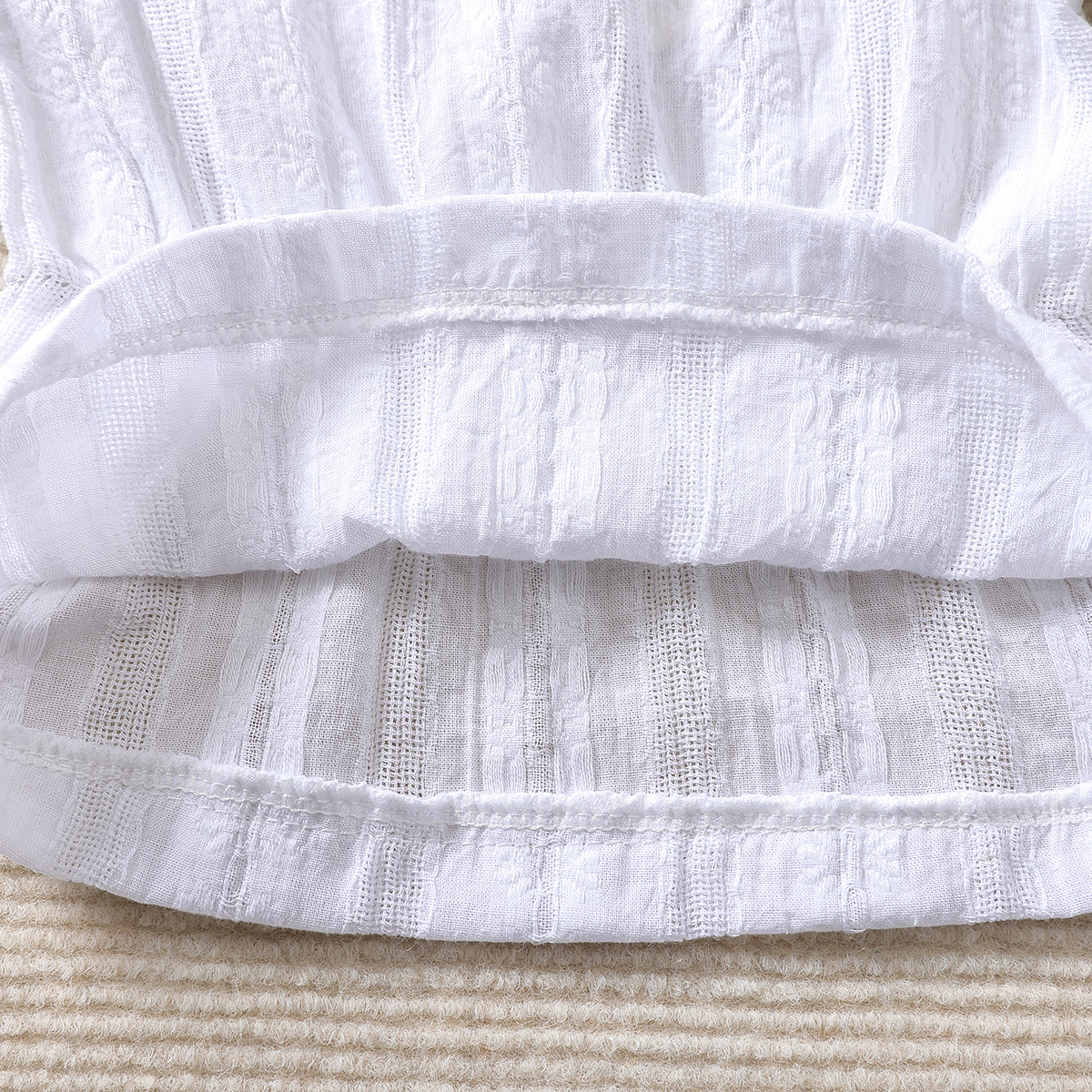 -Bluză/cămașă albă, din material moale din bumbac. Model cu bretele subțiri și mâneci căzute, cu efect „off shoulder”, care oferă un aspect modern. Partea superioară este decorată cu dantelă din bumbac, iar în talie are o ușoară fronsare și elastic pentru o formă bine definită. Mânecuțele sunt finisate cu accente din dantelă și o deschidere delicată.