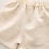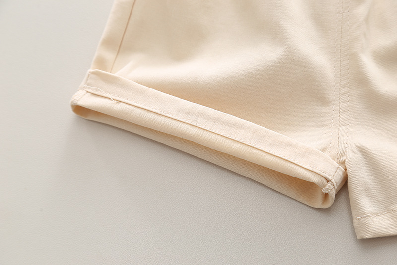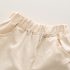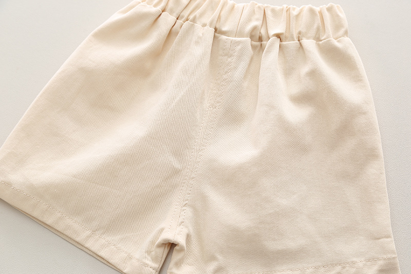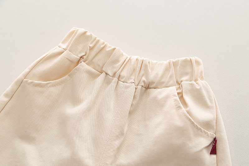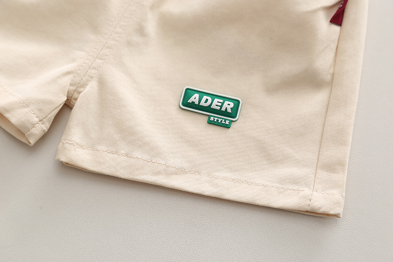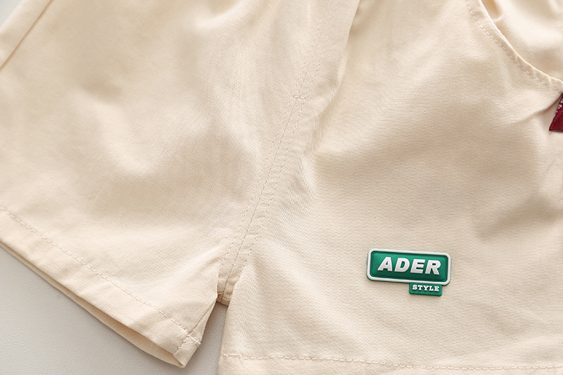 – Pantaloni scurți în bej deschis, cu talie elastică pentru îmbrăcare ușoară și buzunare laterale comode. O mică emblemă pe crac accentuează stilul atletic, iar croiala lejeră permite libertate totală de mișcare.