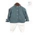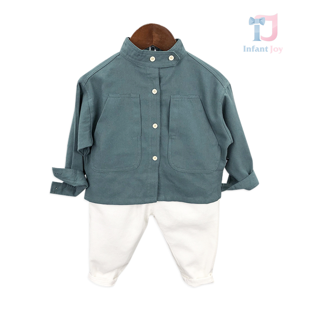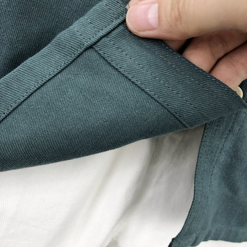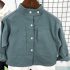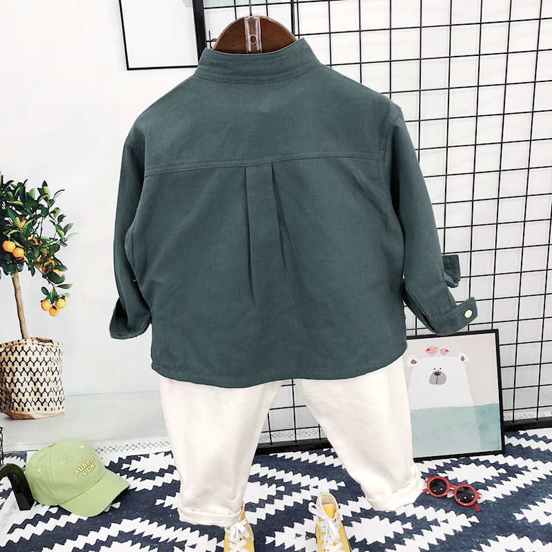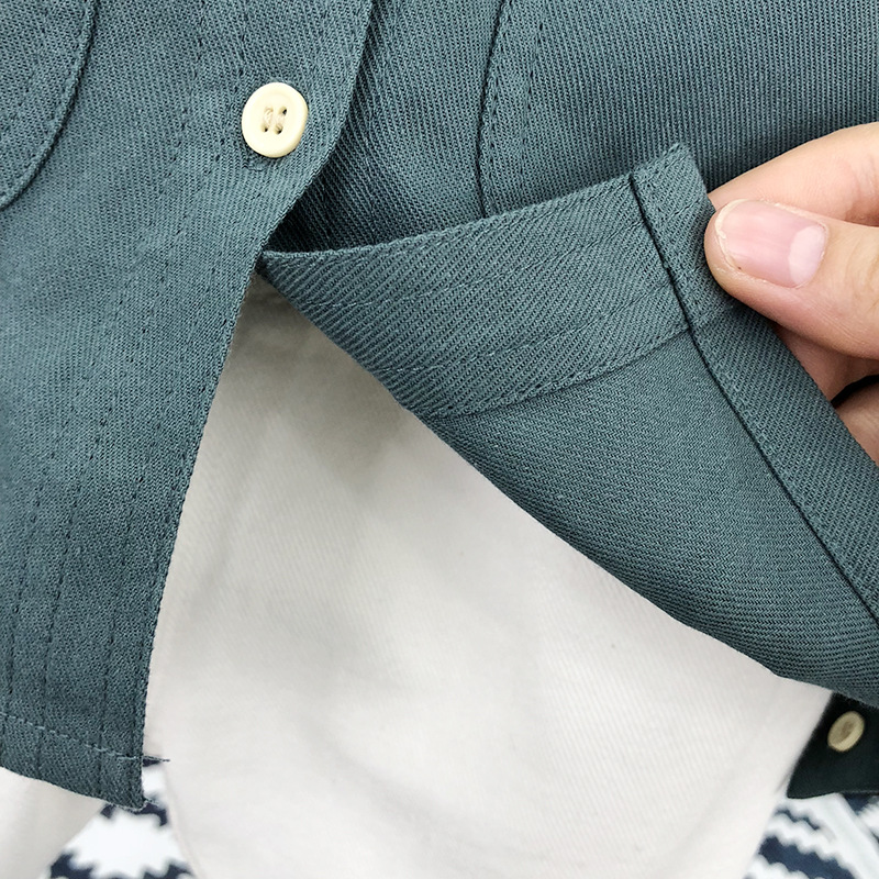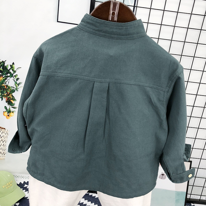 -Cămașă cu mânecă lungă din bumbac dens, în nuanță verde închis, cu design interesant tip încrucișat și guler înalt cu nasturi decorativi. Are două buzunare frontale mari, care oferă un aspect urban și practic.