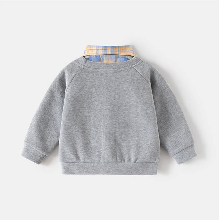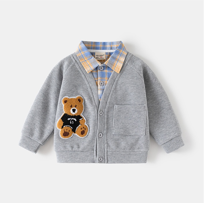– Vestă tricotată, moale, de culoare gri deschis, cu o cămașă atașată în carouri frumoase albastru-galben. Efectul este ca și cum ar fi două haine într-una – fără volum inutil și cu mare confort la îmbrăcare. Vesta are decolteu în V, nasturi în față și un buzunar practic în partea din față. Pe lateral este aplicat un mare ursuleț 3D din pluș, care adaugă un farmec jucăuș și copilăresc.