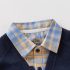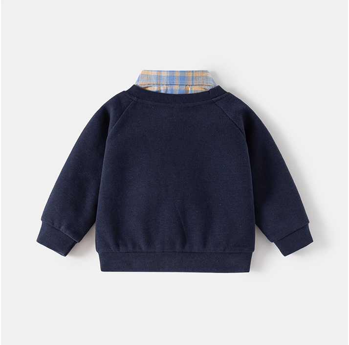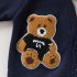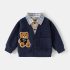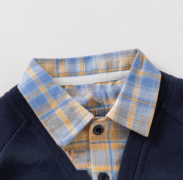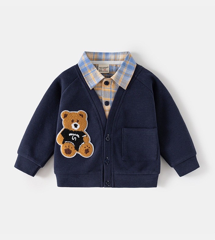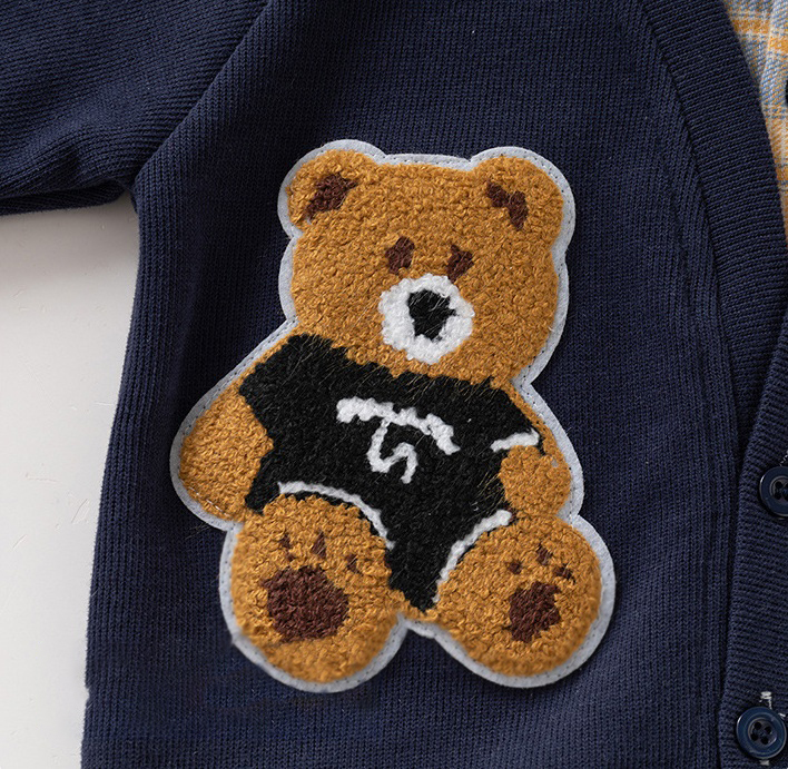 – Jachetă bleumarin, moale, tricotată, cu cămașă atașată într-un frumos model în carouri albastru-galben. Efectul este de două haine în una – fără volum inutil și cu mare confort la îmbrăcare. Jacheta are decolteu în V, nasturi în față și buzunar practic în partea din față. Pe lateral este aplicat un mare ursuleț 3D din pluș, care adaugă un farmec jucăuș și copilăresc.