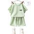 -Tricou realizat din material tip waffle, într-o nuanță pastel verde. Model cu croială lejeră și emblemă neagră în contrast, care adaugă un accent modern.