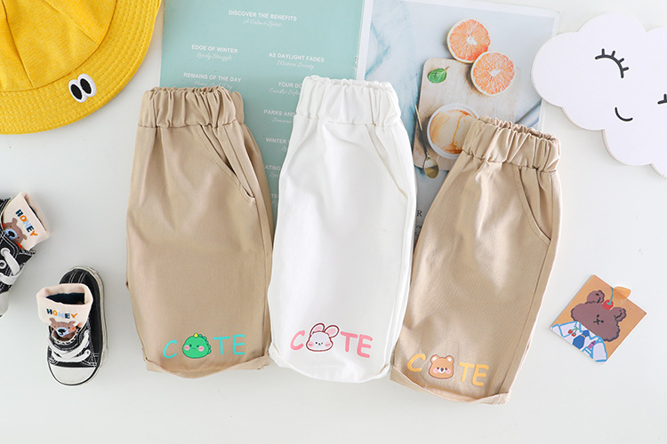 -Pantaloni scurți în nuanță moka, din material moale cu talie elastică pentru confort – cu două buzunare și un imprimeu cu inscripție pe un crac, pentru un look simpatic