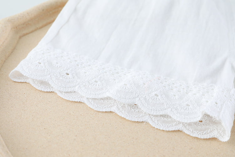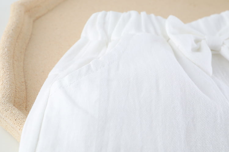 -Pantaloni scurți din bumbac fin, de culoare albă, cu talie elastică și două buzunare. Design cu dantelă delicată la tiv și fundiță cusută în talie pentru un plus de eleganță.