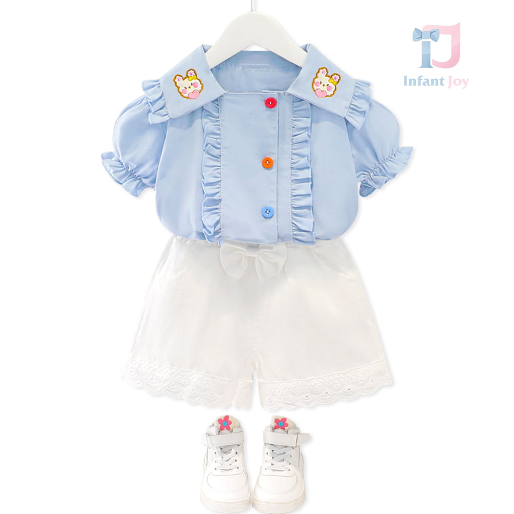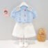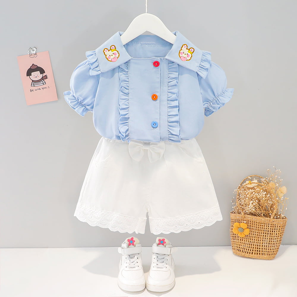 -Bluză/cămașă din bumbac ușor și de calitate superioară, în culoare albastră. Model cu mâneci bufante scurte, guler atrăgător decorat cu broderie, volane în partea din față și nasturi colorați, pentru un look adorabil.