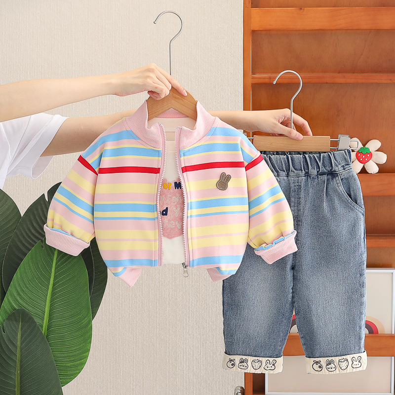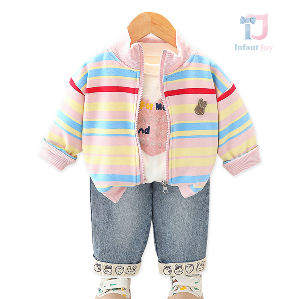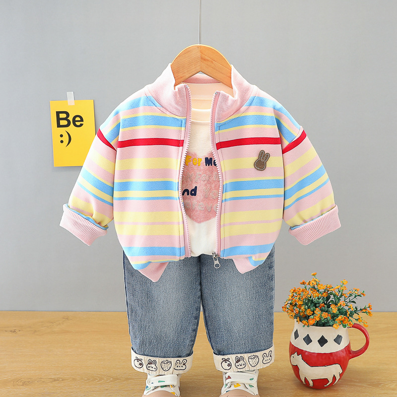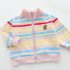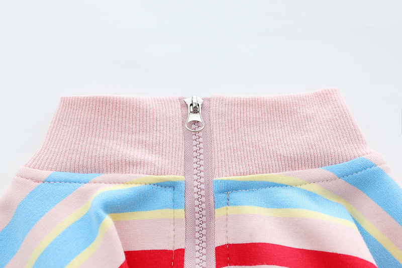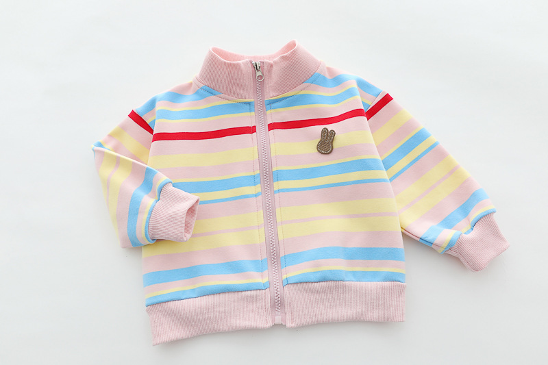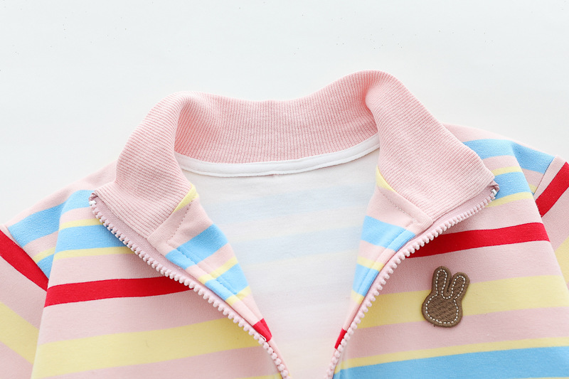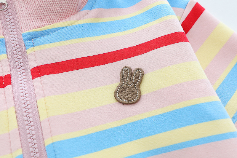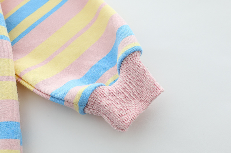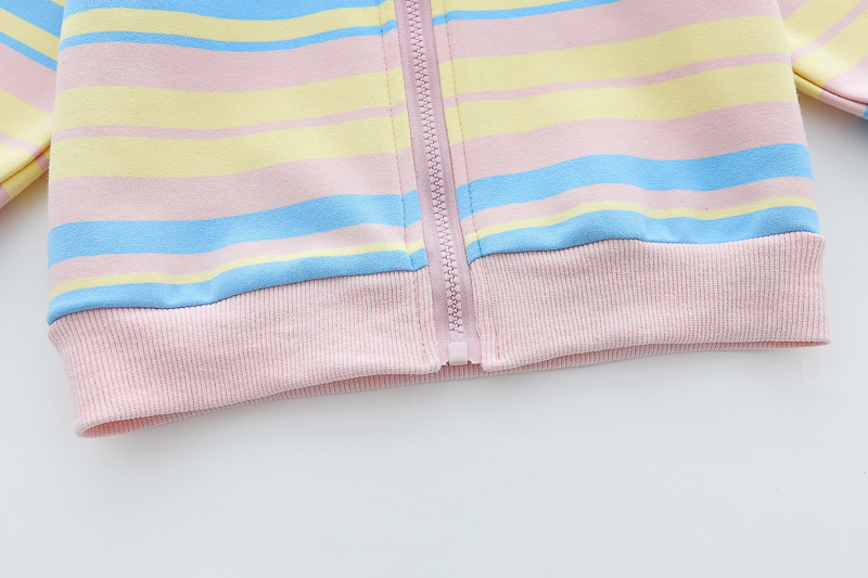 – Hanorac cu guler înalt și fermoar complet, confecționat din bumbac de înaltă calitate. Dungi colorate all-over în roz pastel, albastru acvatic, galben și roșu. Mâneci raglan cu manșete ribate și tiv elastic – pentru o potrivire confortabilă. Broderie mică cu iepuraș pe piept – un accent jucăuș.