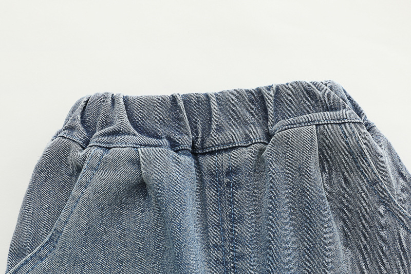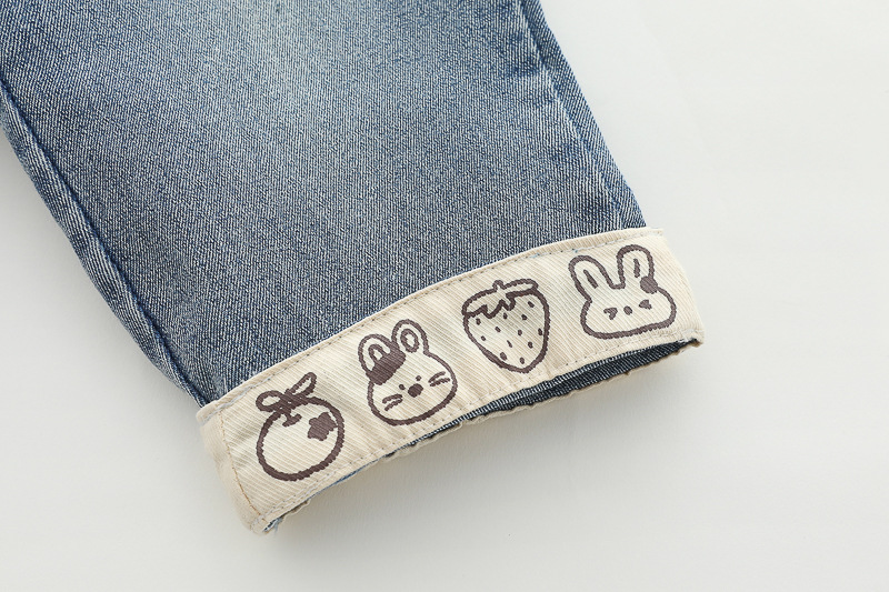 – Pantaloni din denim bleumarin mediu, cu talie elastică pentru îmbrăcare ușoară și două buzunare laterale. Tivurile sunt răsucite și decorate cu imprimeuri viu colorate cu animale – un detaliu proaspăt și modern.