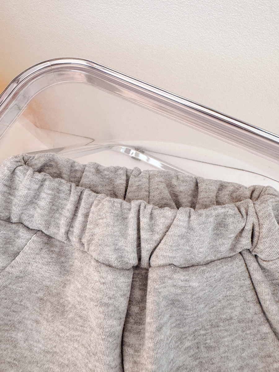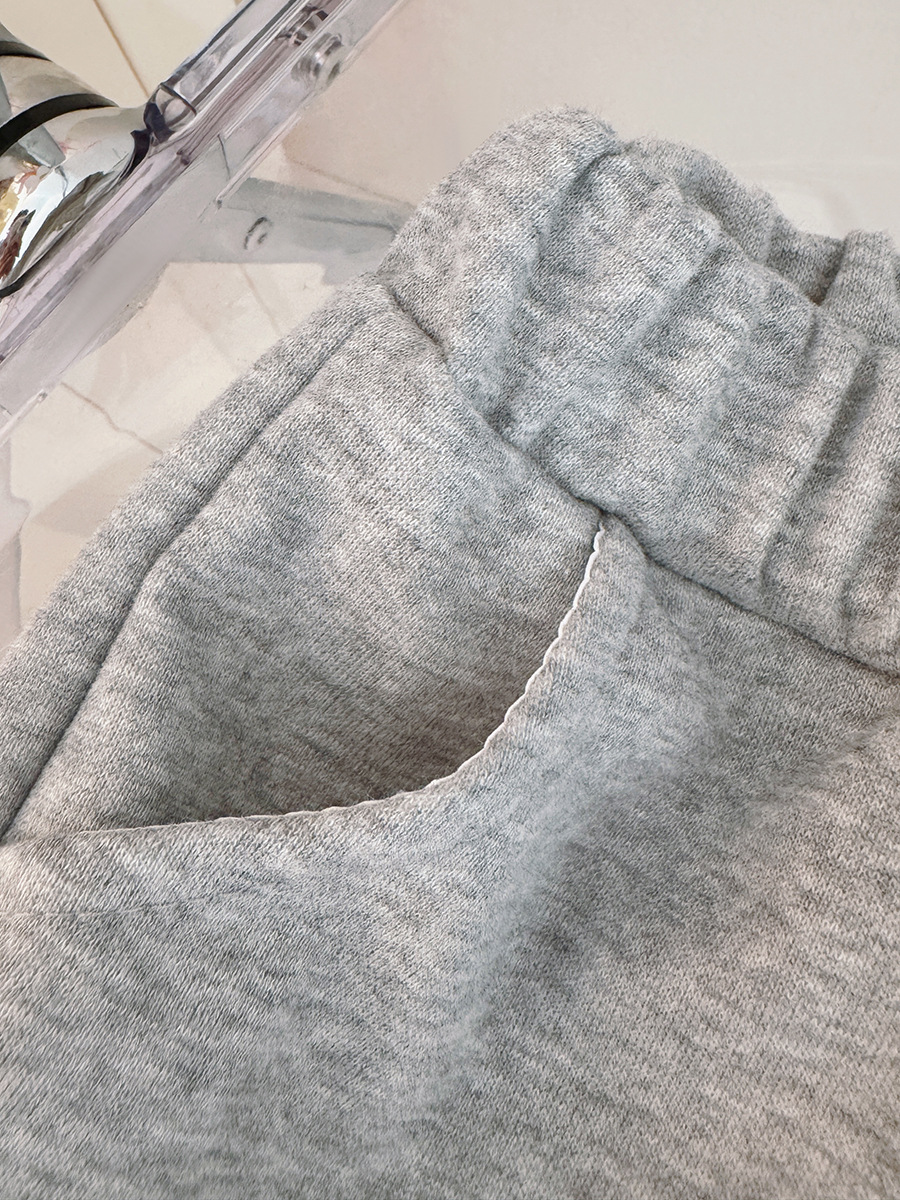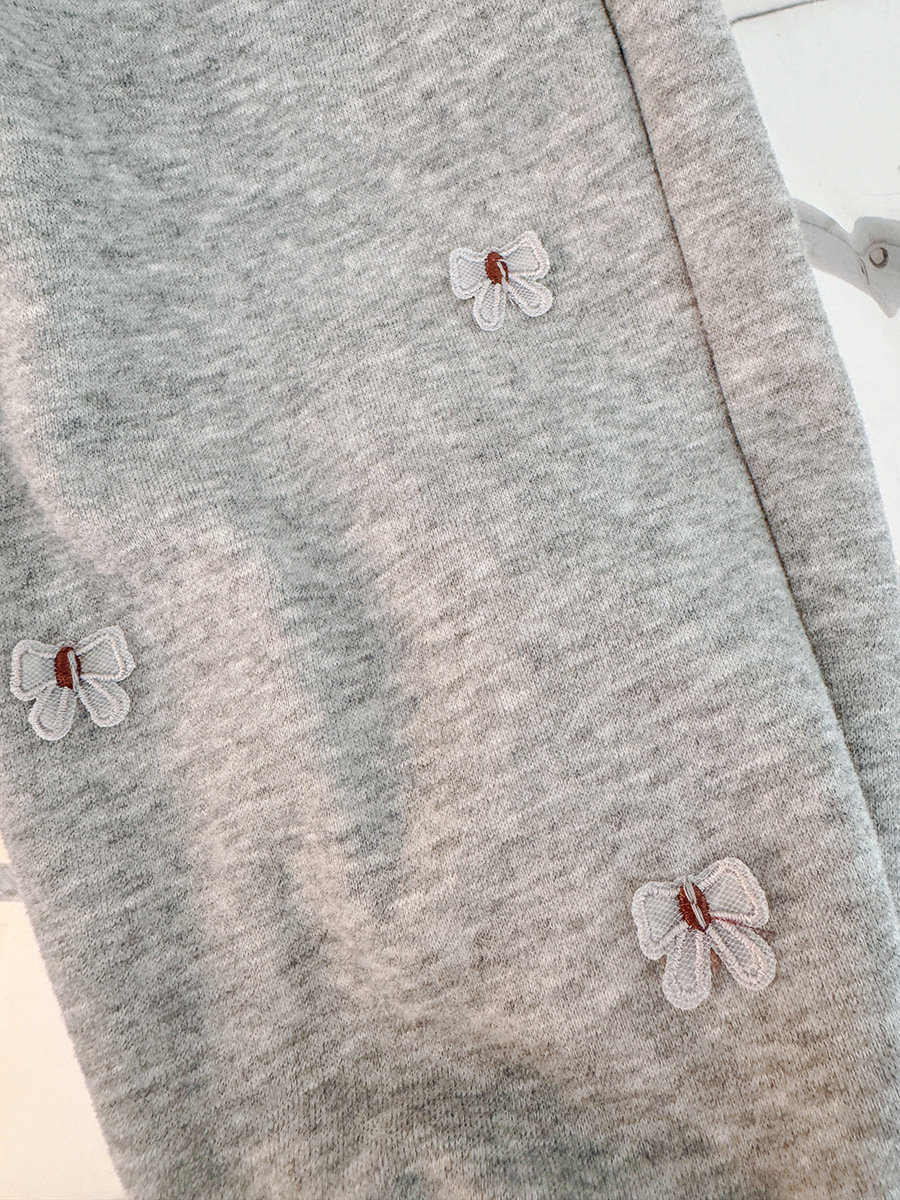 – Pantalon sport gri deschis, decorat cu fundițe mici cusute pe toată lungimea. Talie elastică și manșete elastice la glezne – pentru confort deplin și îmbrăcare ușoară.