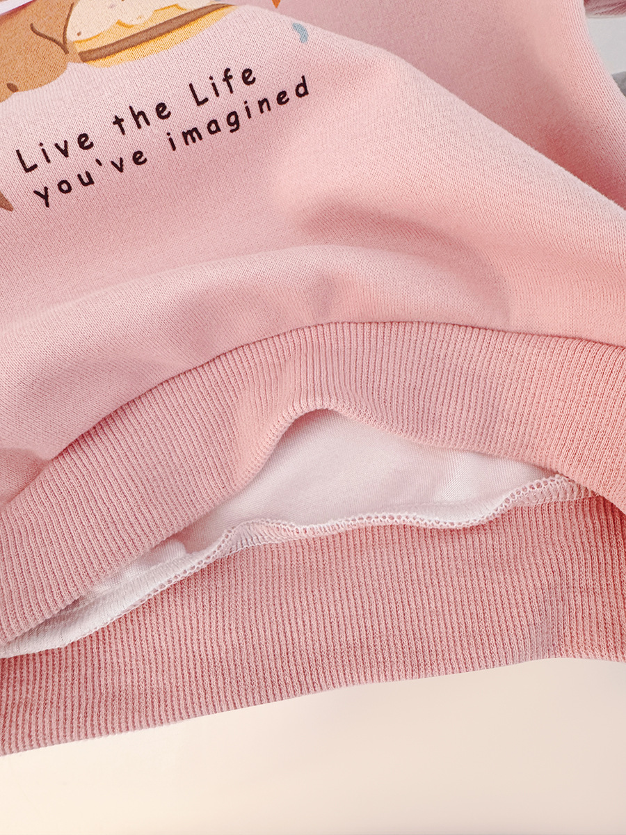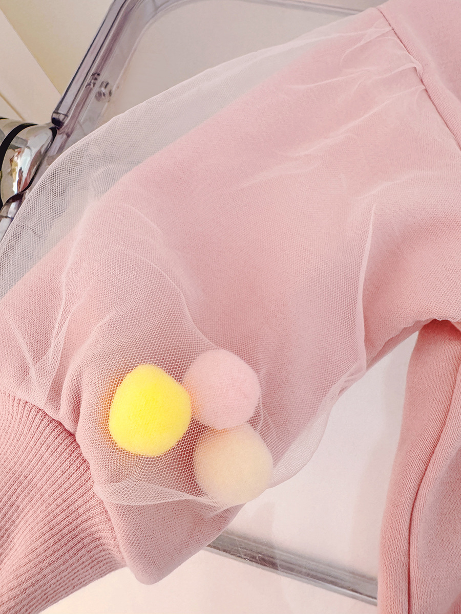 – Bluziță/Hanorac în roz pal, confecționat din bumbac moale, cu imprimeu care ilustrează o petrecere și mesajul „Live the life you’ve imagined”. Mânecile sunt acoperite cu tul fin și decorate cu aplicații 3D sub formă de biluțe pufoase și colorate – pentru un look jucăuș și feminin.
