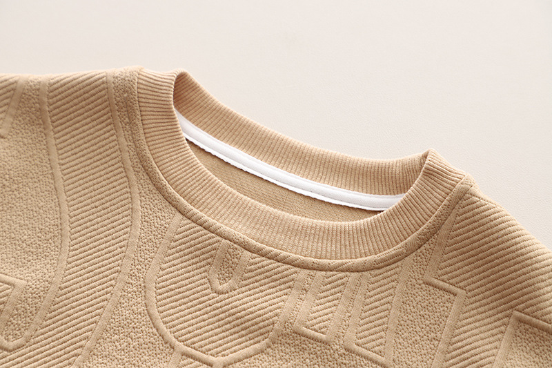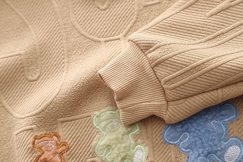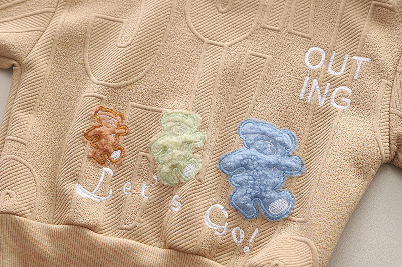 – Hanorac în nuanță bej-maroniu moale, cu model în carouri 3D în relief ca fundal. Decolteu rotund, mâneci raglan și tiv elastic pentru o potrivire confortabilă. Broderie centrală “Let’s Go!” și trei ursuleți din pluș în tonuri ombre (portocaliu, lime, bleu), iar inscripția “OUTING” în alb adaugă un accent jucăuș.