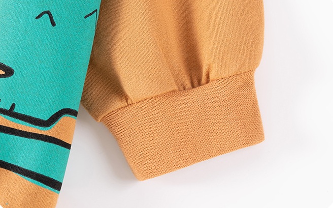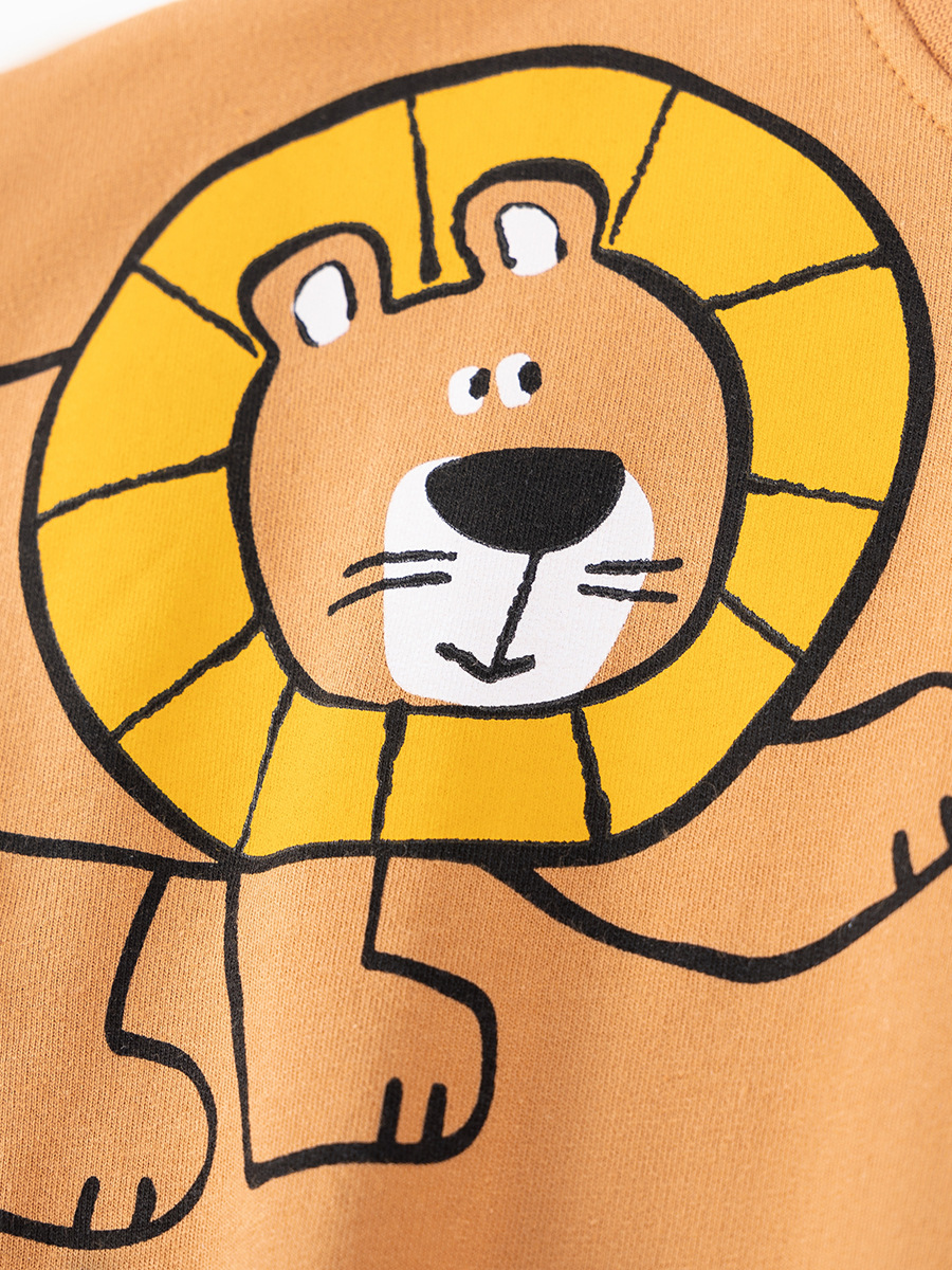 – Bluză cu mânecă lungă, confecționată din bumbac, în nuanță caramel cald. Decorată cu imprimeuri vesele cu animale safari – leu și crocodil – pentru un aspect jucăuș și energic.