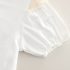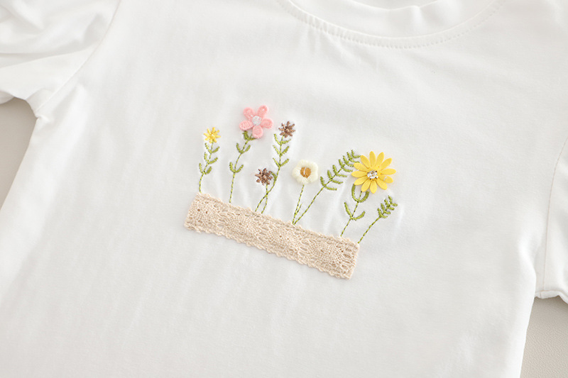 -Bluză cu mâneci bufante, albă, confecționată din bumbac elastic. Model cu decolteu rotund și manșete fine, elastice. Umerii sunt decorați cu dantelă, iar partea din față este împodobită cu aplicații de floricele și o panglică din dantelă – pentru un accent romantic și rafinat.