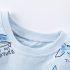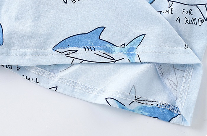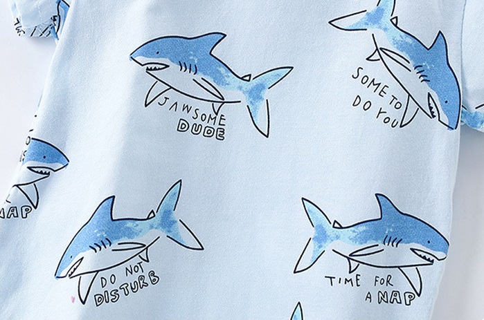 -Tricou din bumbac, în nuanță bleu ciel. Decorat cu imprimeuri haioase cu rechini în diverse poziții și texte amuzante precum „Jawsome Dude“, „Some to do you“ și „Time for a dive“. Fundalul deschis evocă cerul și marea, inducând o stare veselă. Gulerul este moale și elastic, ideal pentru îmbrăcare ușoară.