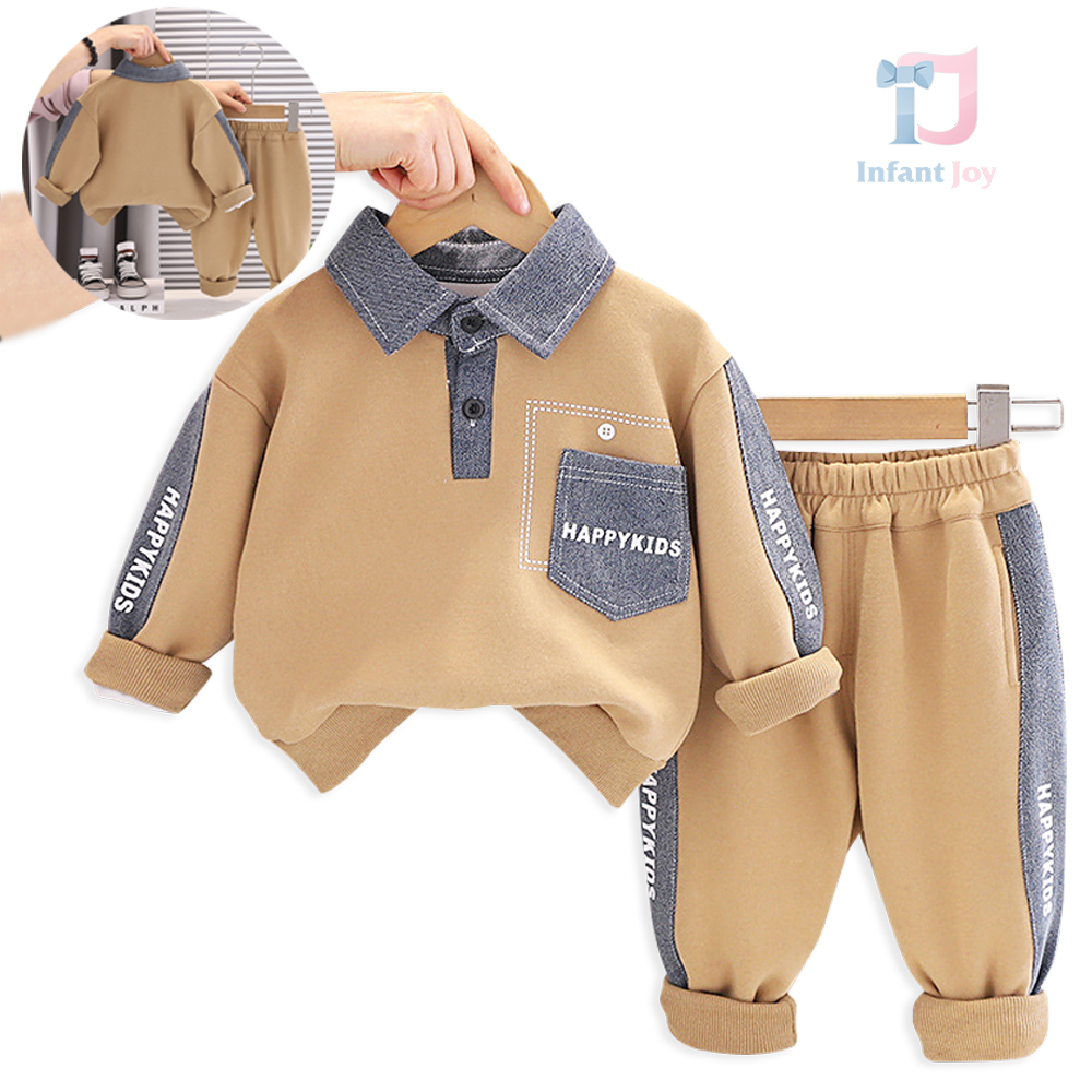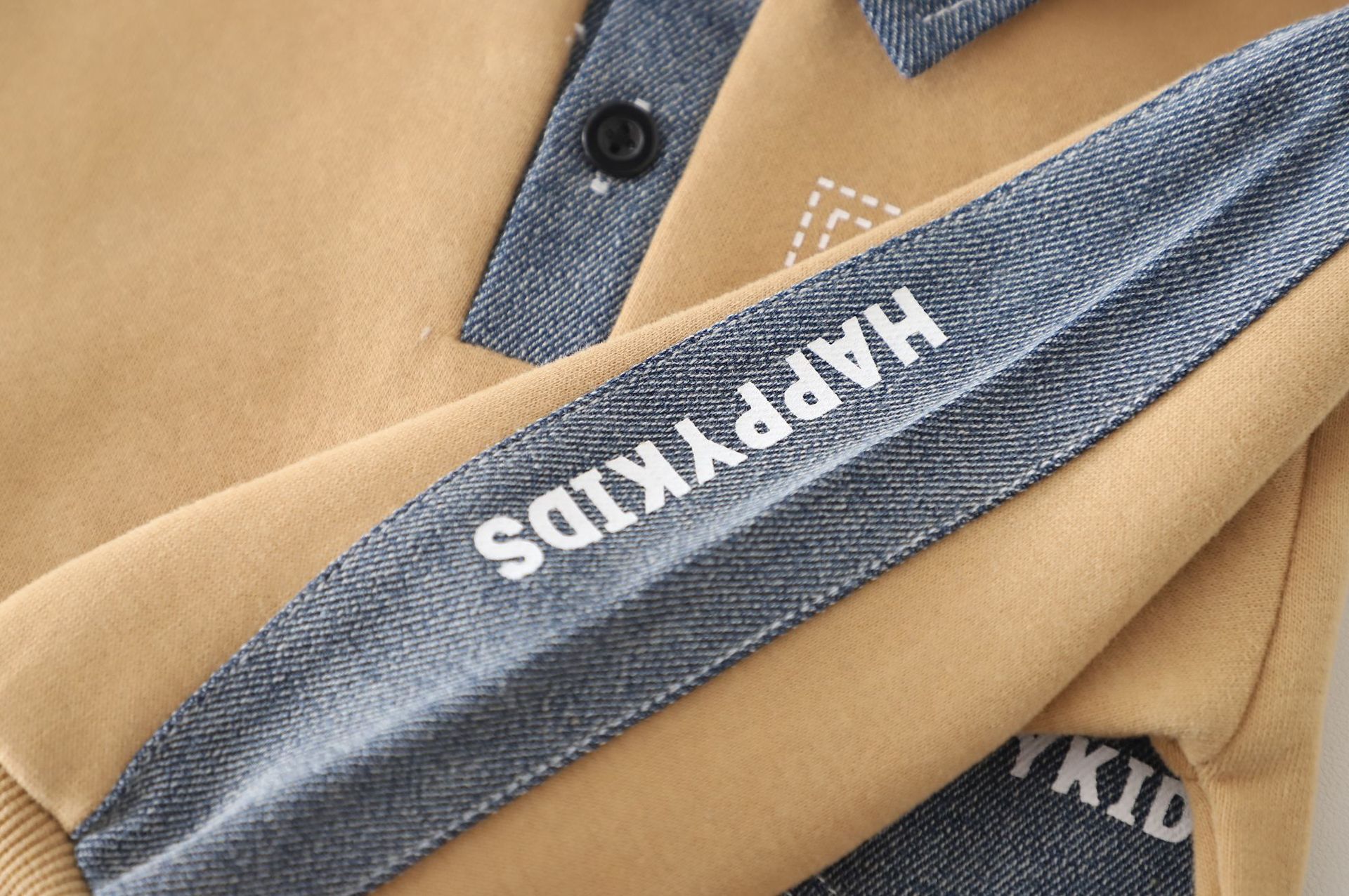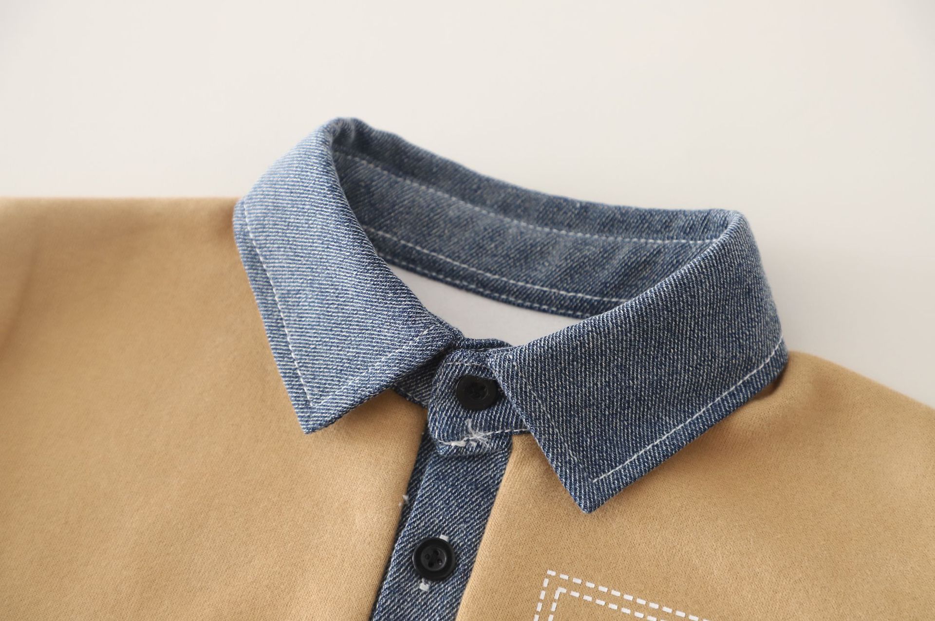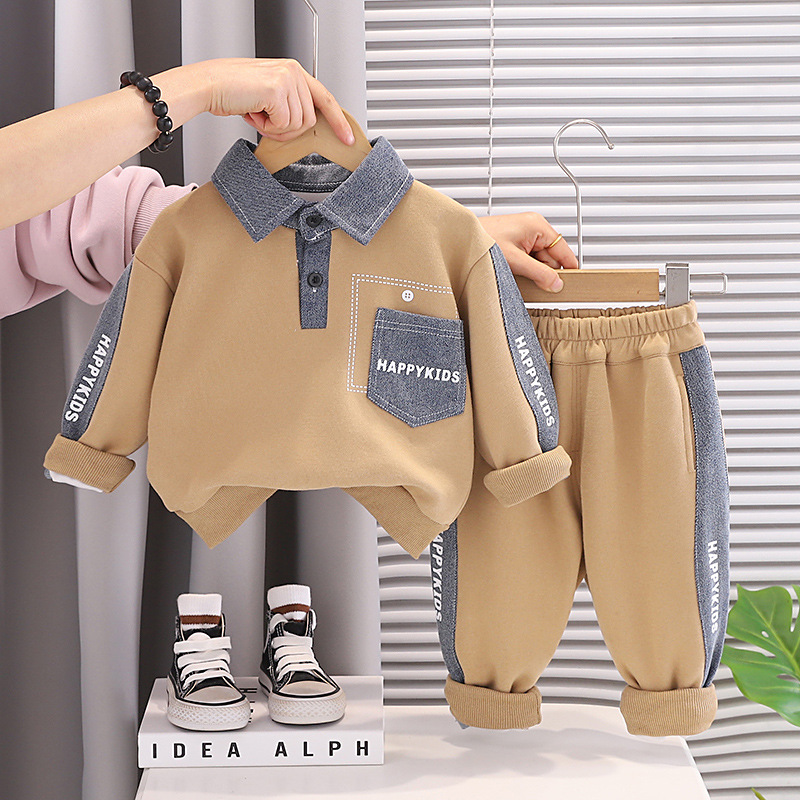 🍬 Set din 2 piese pentru băiat, în culoare caramel, cu accente din denim – confortabil și practic pentru purtarea zilnică.