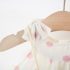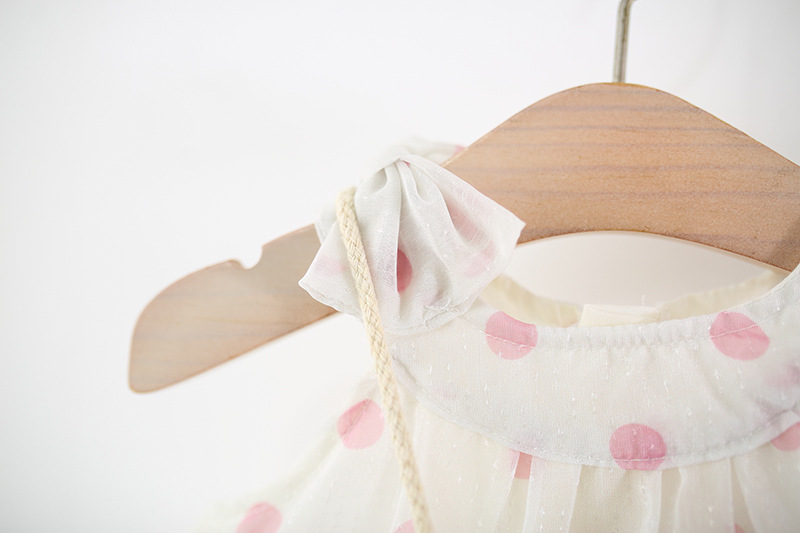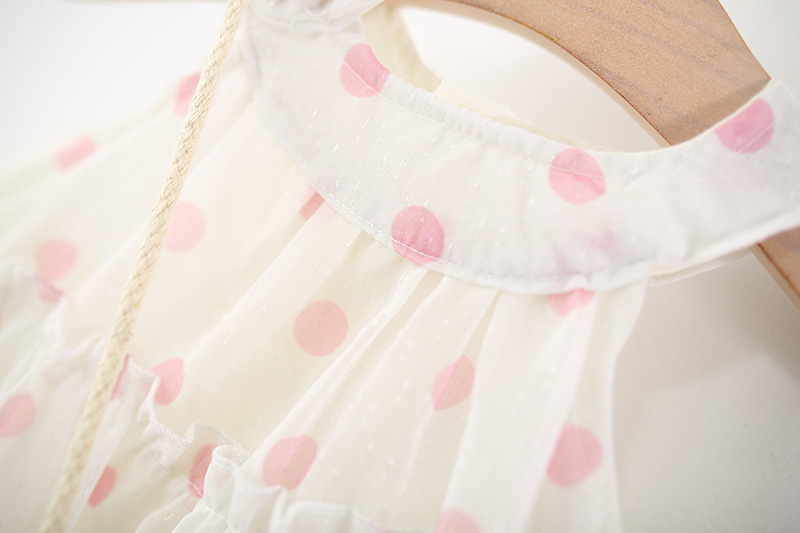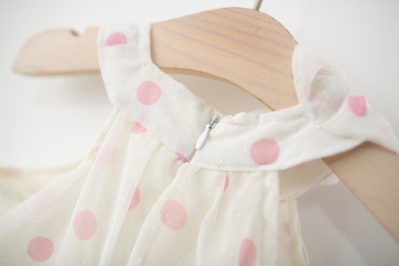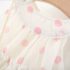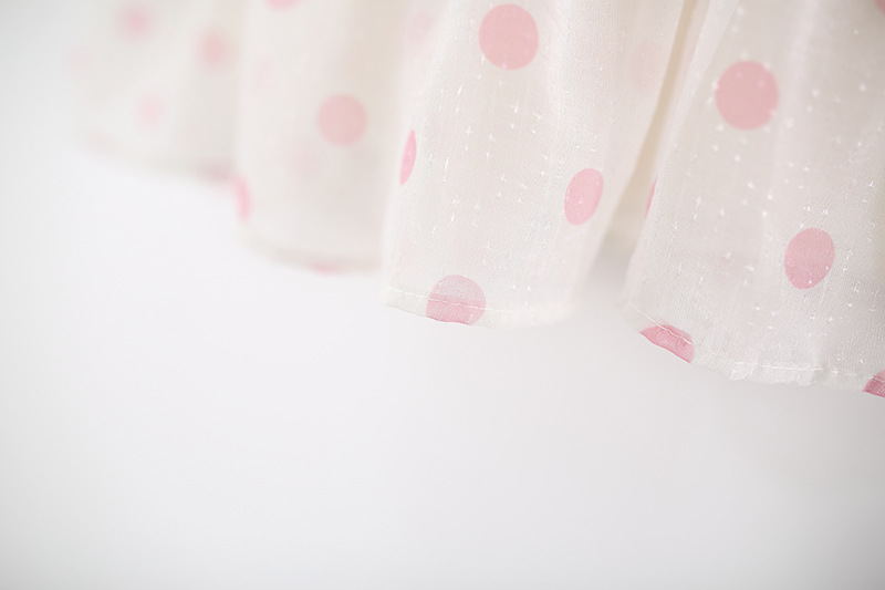– Rochie confecționată din material de calitate superioară, în crem-alb cu imprimeu de buline roz. Croială evazată, cu mai multe straturi de volane vaporoase pentru un plus de volum. Decolteu tip “halter” cu volănaș delicat în jurul gâtului. Fără mâneci, cu căptușeală din bumbac – ideală pentru vară.