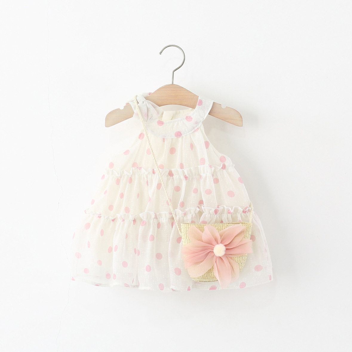 Set de 2 piese cu rochie cu decolteu halter, volane și borsetă de umăr cu floare 3D Poppy Dots