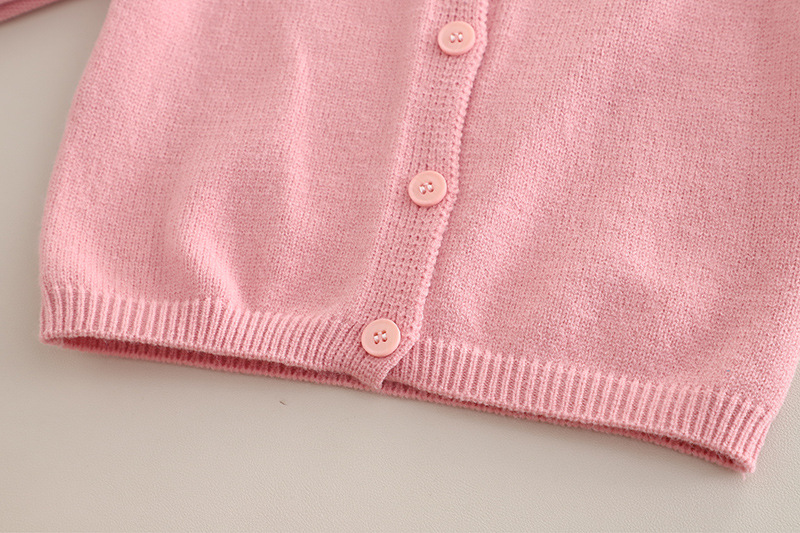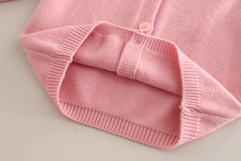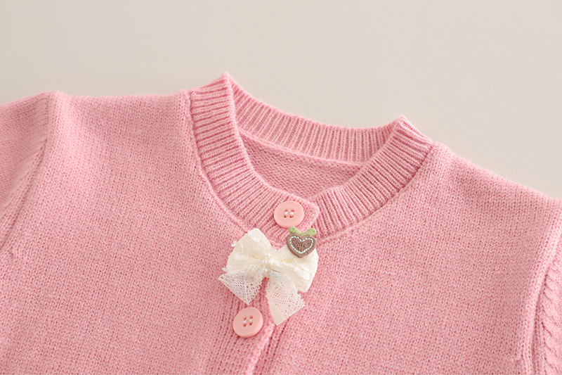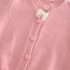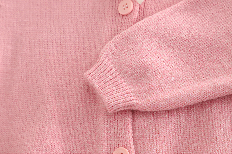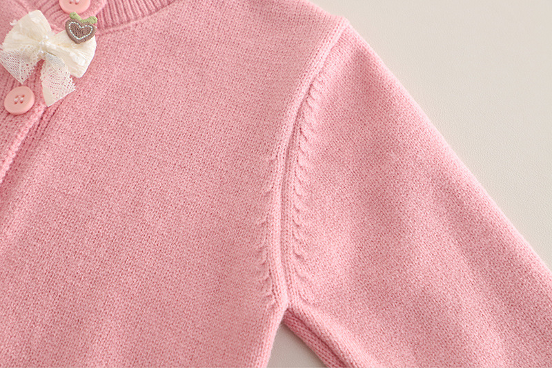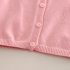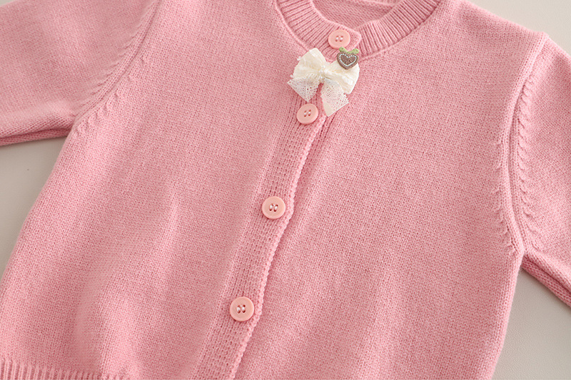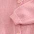 – Cardigan tricotat fin într-o nuanță delicată de roz pastel. Croială dreaptă clasică, închidere cu nasturi. Accesorizat cu o fundiță textilă decorativă și o inimioară brodată pe piept.