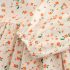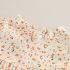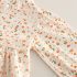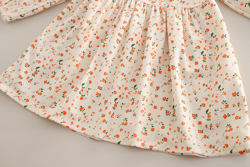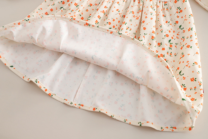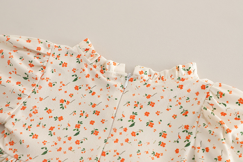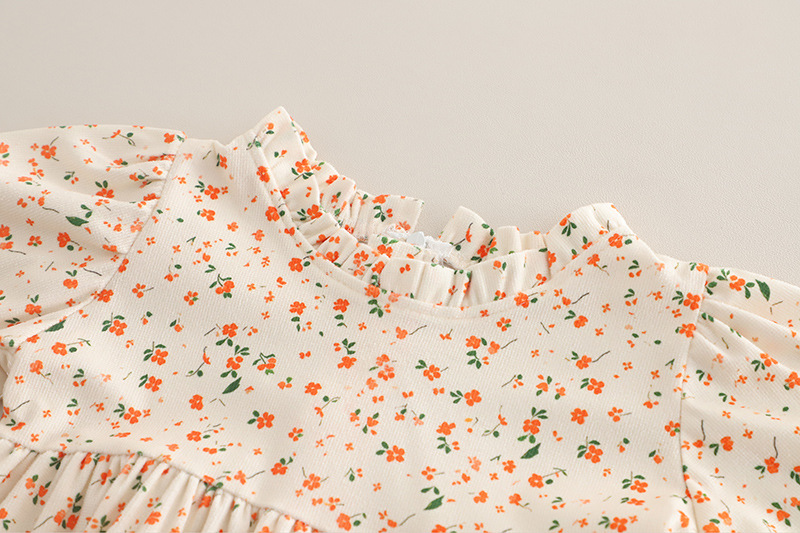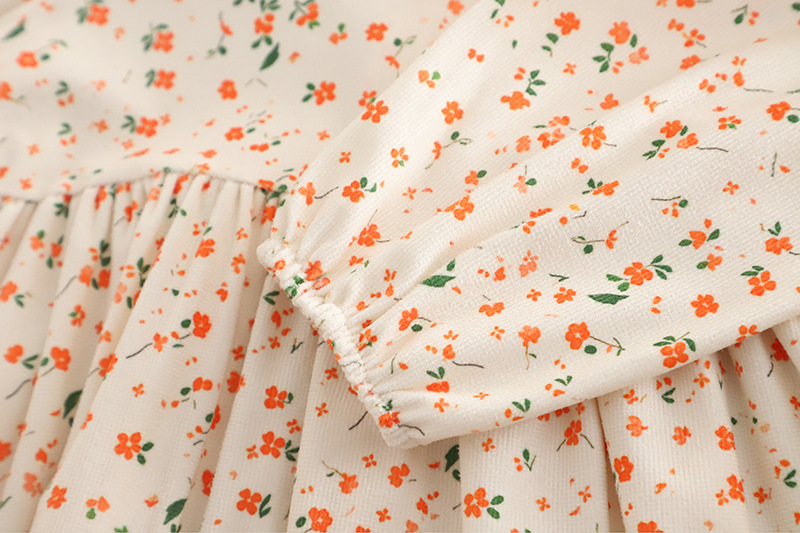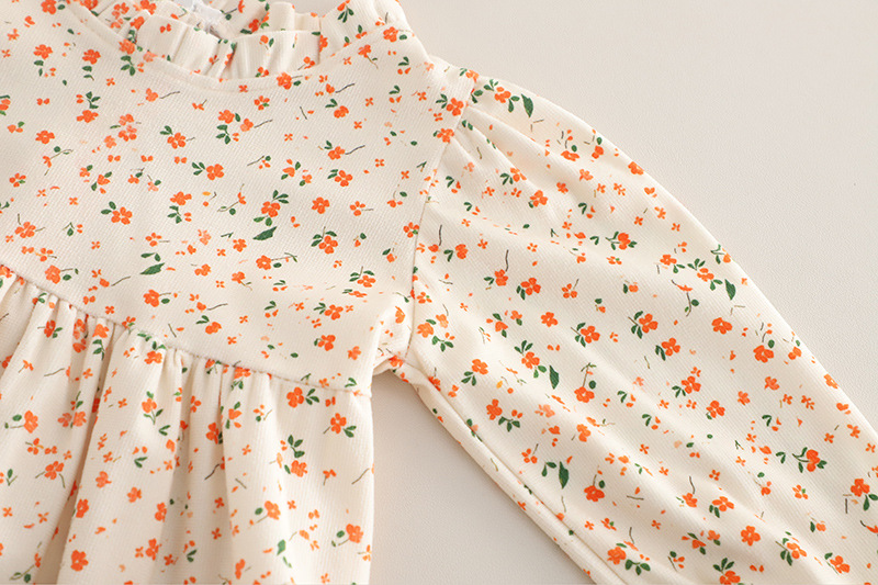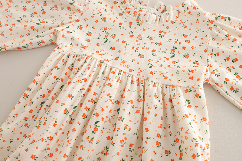 – Rochie cu mânecă lungă, în crem, cu imprimeu floral mărunt în portocaliu și verde. Confecționată dintr-un material tip gofrat, moale și ușor. Model cu decolteu rotund decorat cu volănaș plisat fin. Talia evazată oferă volum și libertate de mișcare. Manșetele elastice mențin mânecile ușor ridicate.