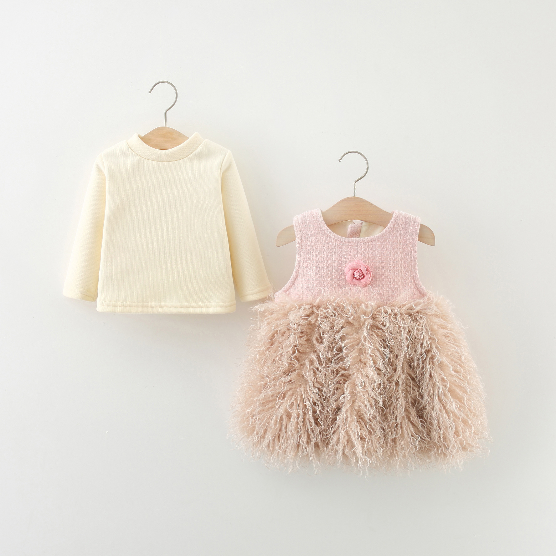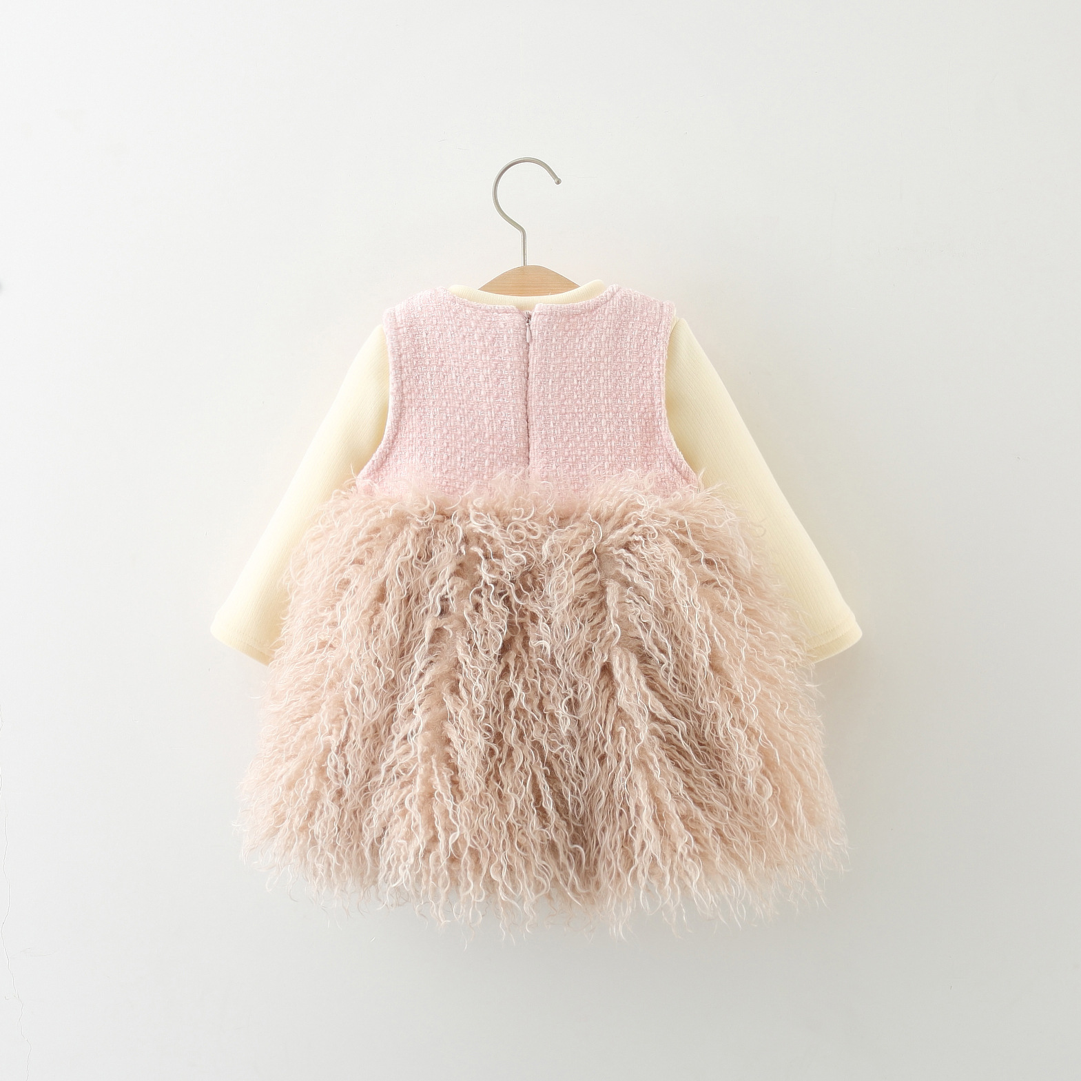 -Rochie căptușită, realizată din pluș boucle de culoare roz, decorată cu o frumoasă aplicație 3D detașabilă în formă de floare. Închidere la spate cu fermoar ascuns. Partea de jos impresionează printr-un finisaj pufos și voluminos din material moale cu fire, care oferă un aspect unic și festiv.
