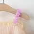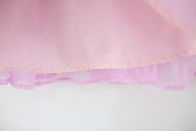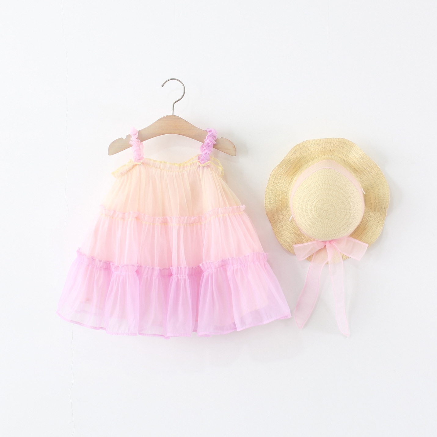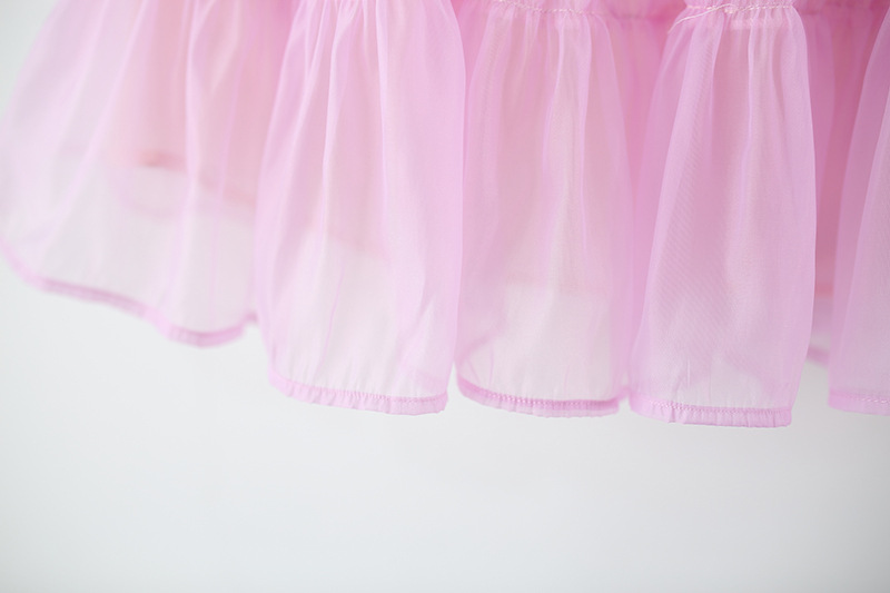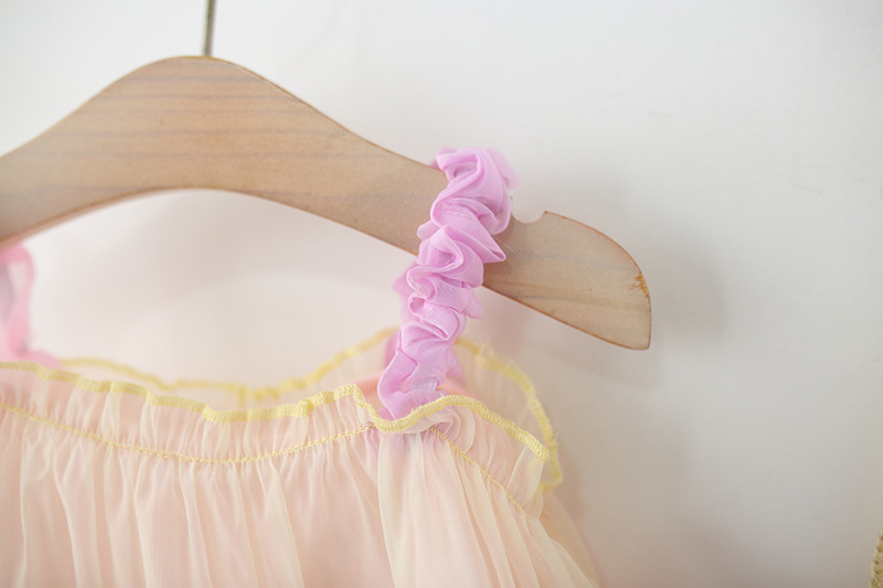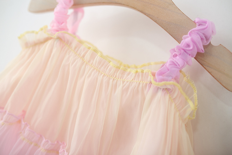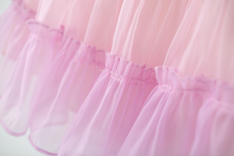 -Rochie realizată din material șifon delicat, într-o combinație de culori pastel – galben, mov și roz, cu efect ombre. Partea superioară este elastică, cu bretele subțiri – una roz și cealaltă mov – decorate cu volănașe. Sunt adăugate volane plisate din tul pe toată lungimea, care oferă volum și un aspect aerat + căptușeală din bumbac pentru confort.