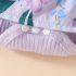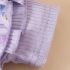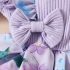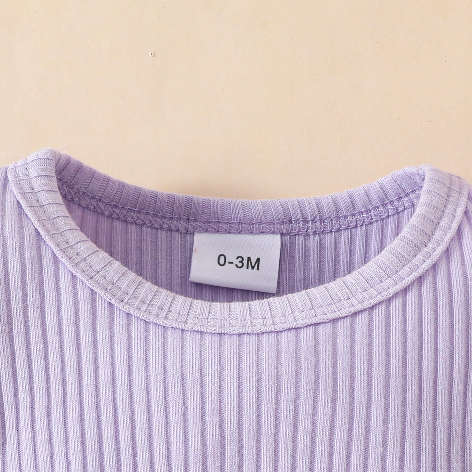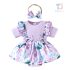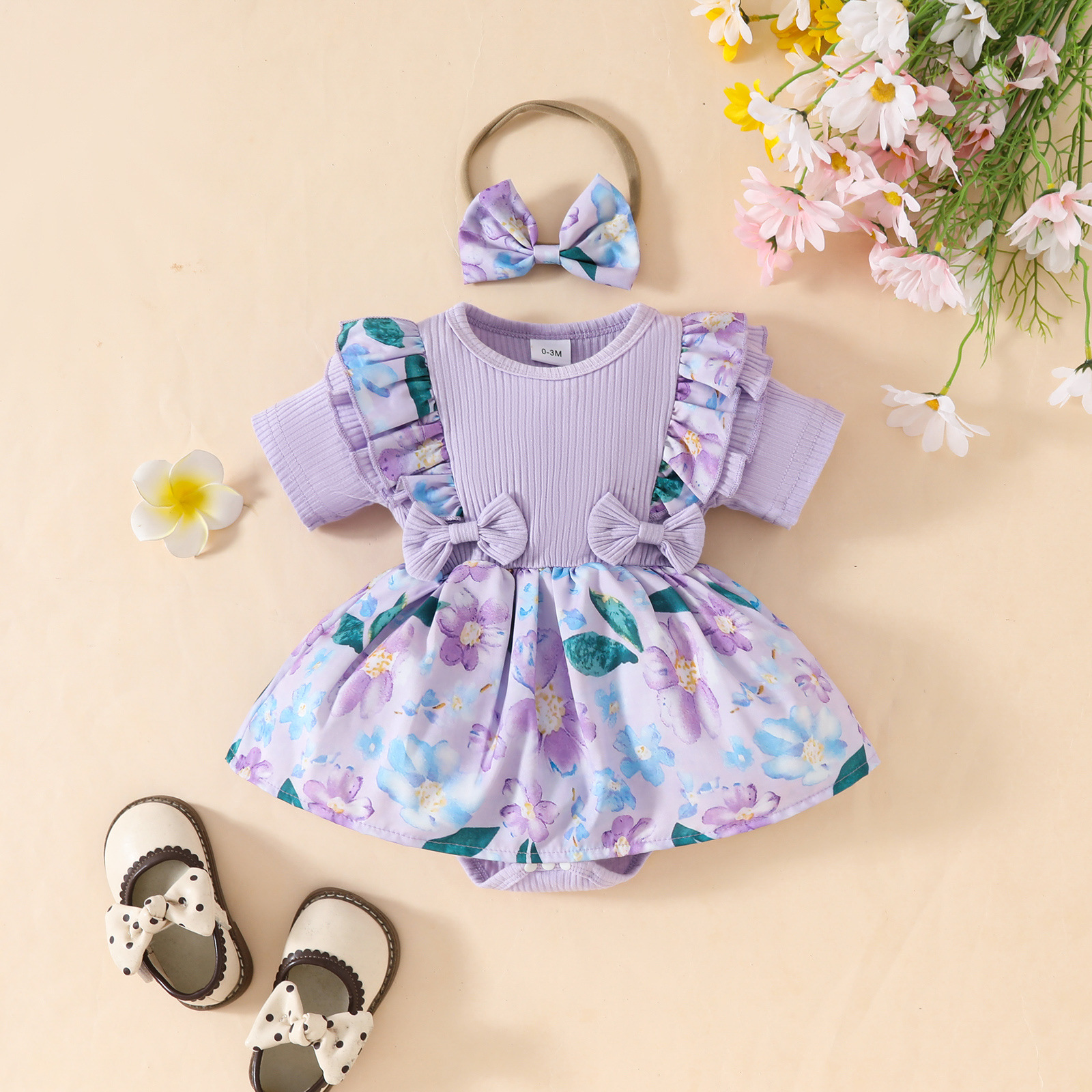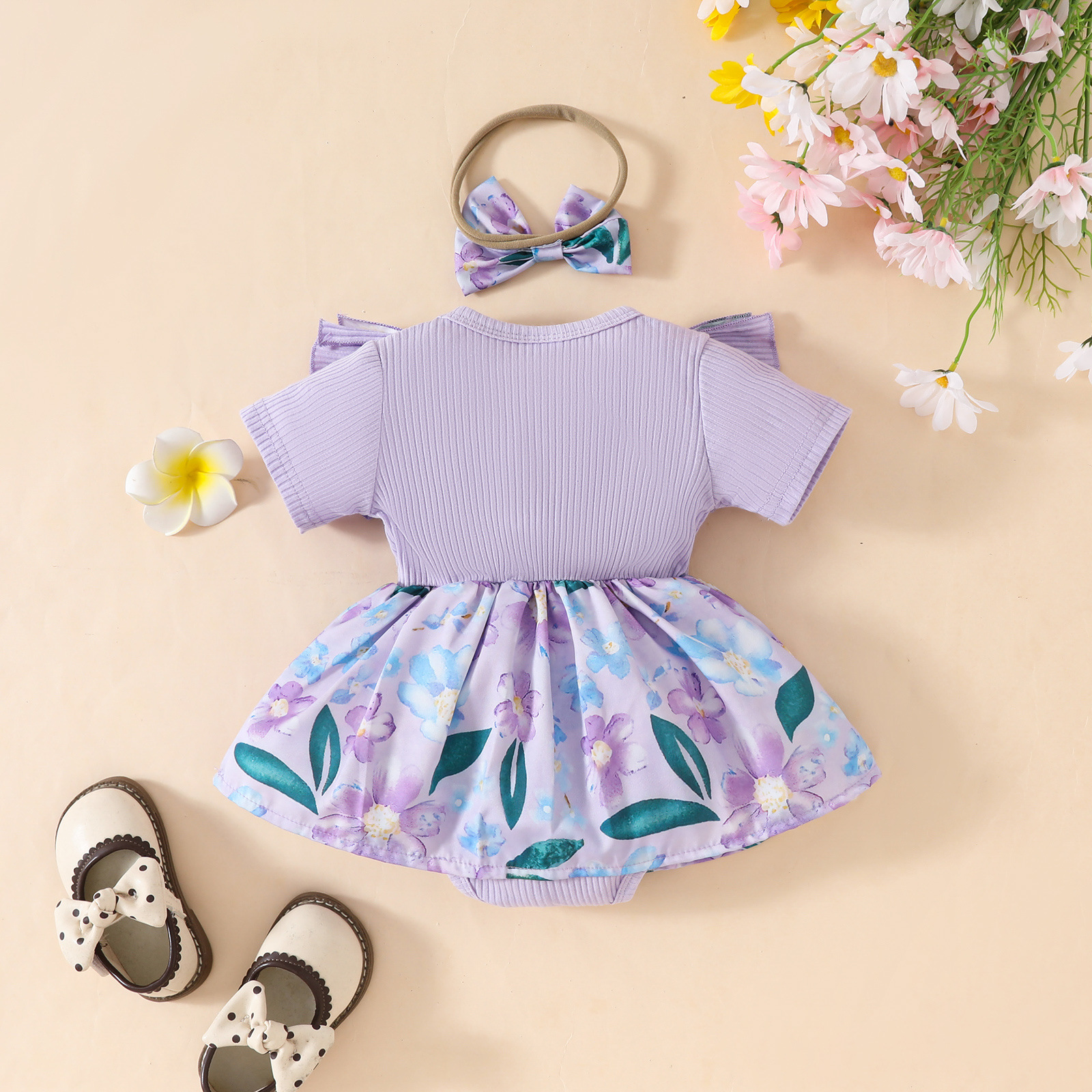 -Rochiță cu body integrat, cu partea superioară din material reiat moale, în nuanță lavandă – model cu mânecă scurtă și croială confortabilă + bretele decorative aplicate, cu volănașe florale în aceeași gamă, decorate cu două fundițe simpatice – fustița are imprimeu cu flori mov, albastre și albe – un look proaspăt și vesel, perfect pentru sezonul primăvară-vară – se închide cu capse în partea de jos pentru o schimbare rapidă și ușoară a scutecului