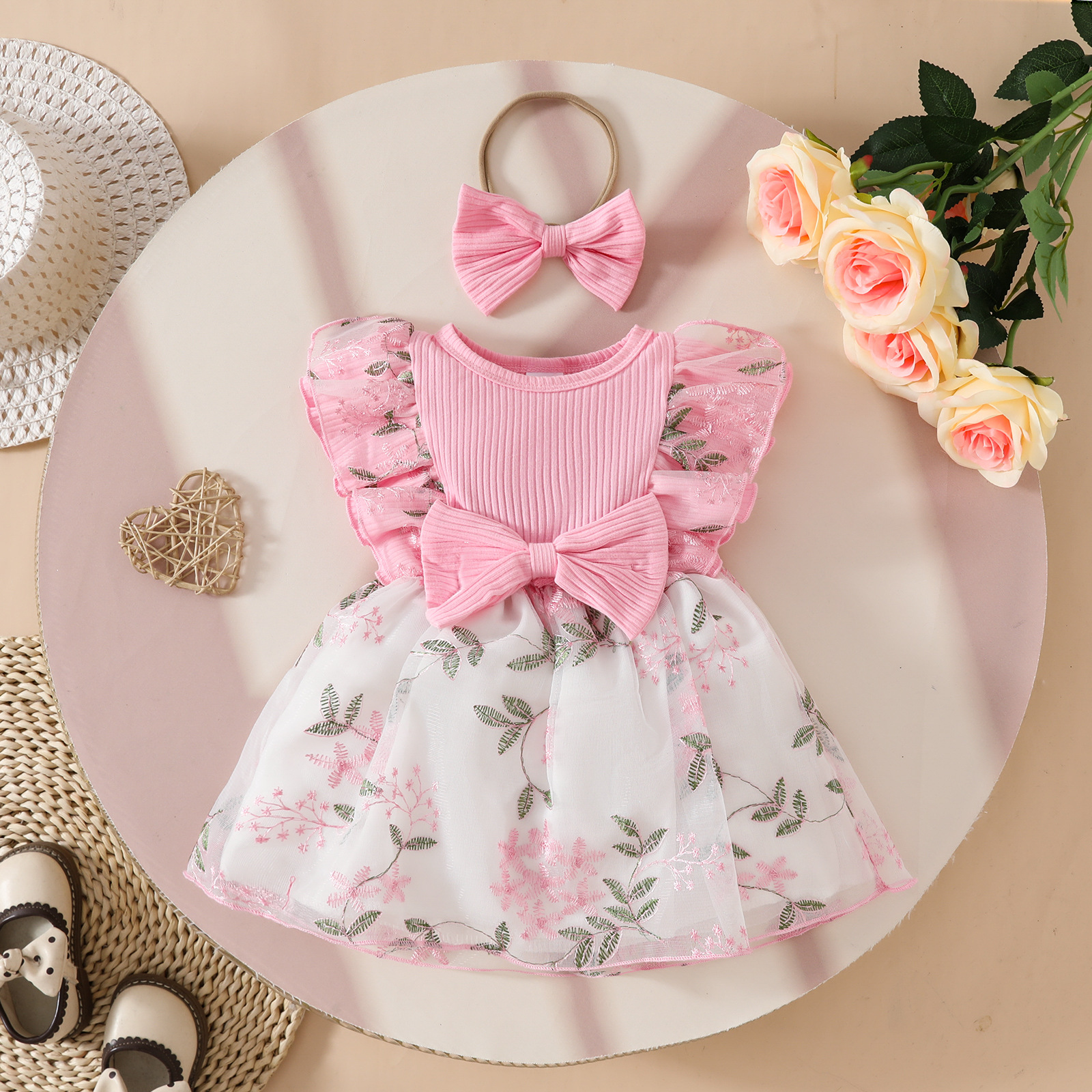 Set de 2 piese cu rochiță din și tulle cu broderii, volănașe și fundiță + bentiță pentru cap Bloom Lullaby