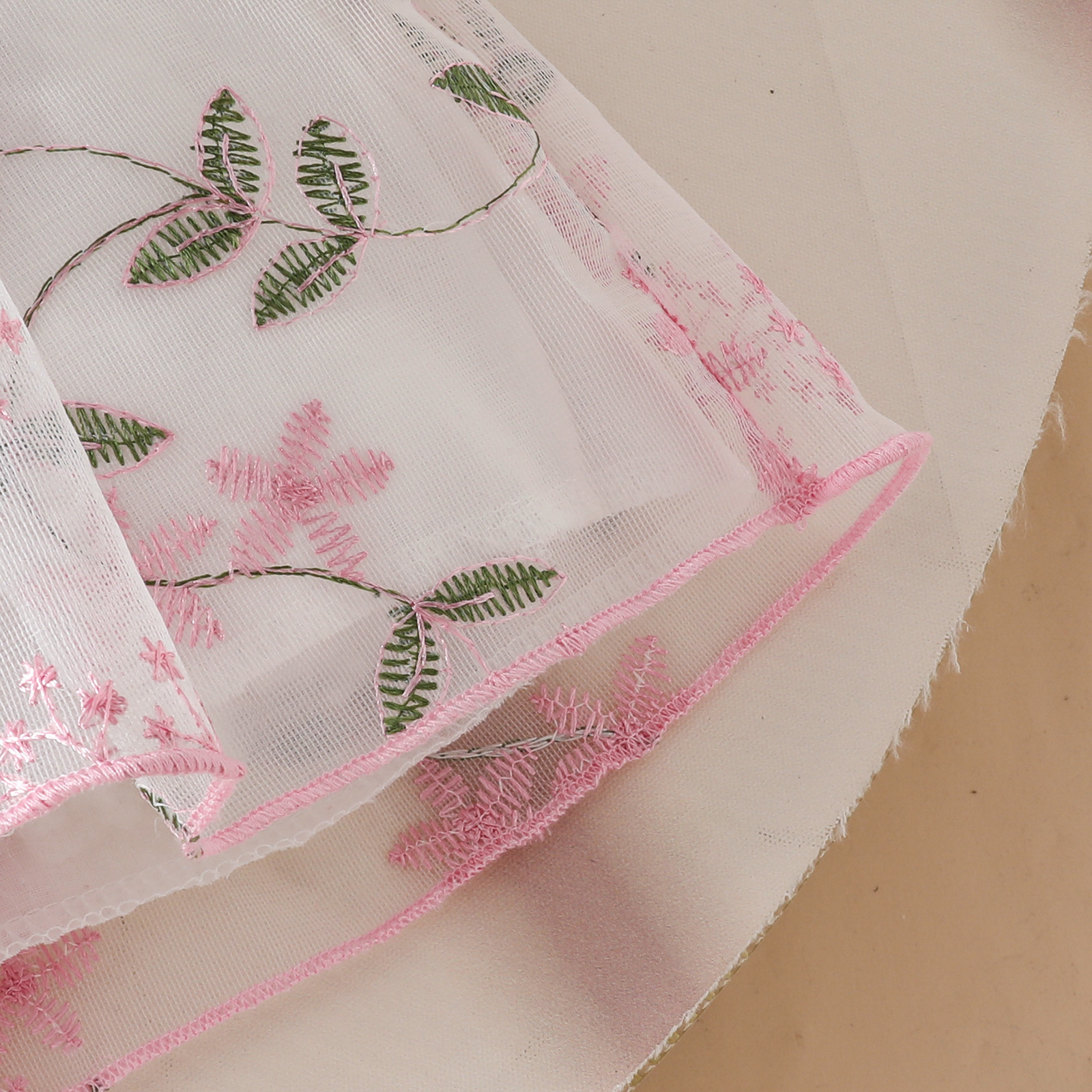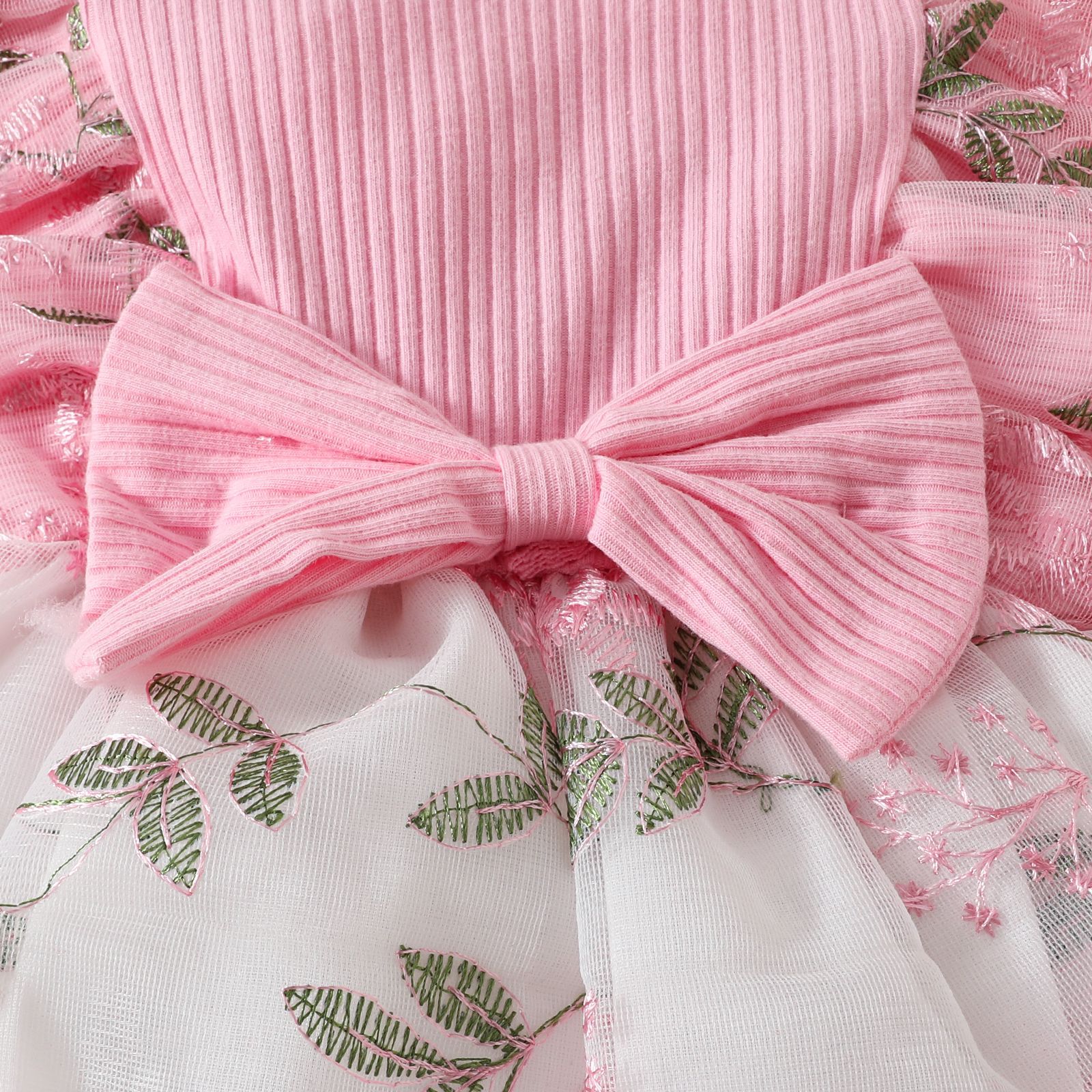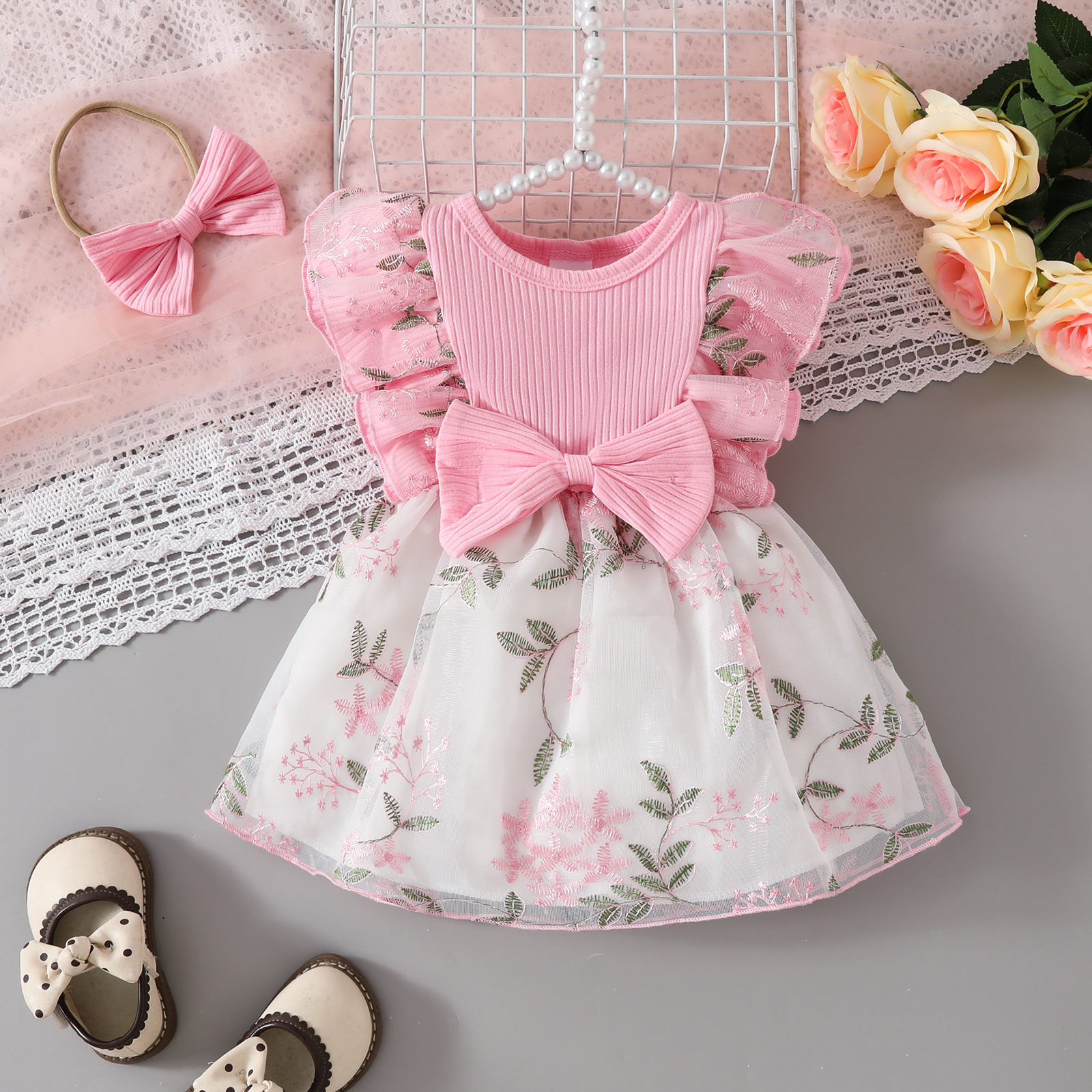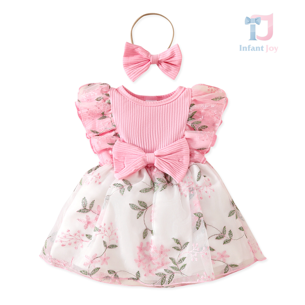 – Rochiță cu body integrat, cu partea superioară din rib moale, într-o nuanță delicată de roz. Model cu mânecă scurtă și croială confortabilă + bretele decorative cu volănașe florale din aceeași gamă cromatică, accesorizate cu o fundă mare în partea din față. Fusta este din tul alb transparent, cu jupon imprimat cu flori – un look proaspăt și plin de viață, perfect pentru sezonul primăvară-vară. Se închide cu capse în partea de jos pentru schimbarea rapidă a scutecului.