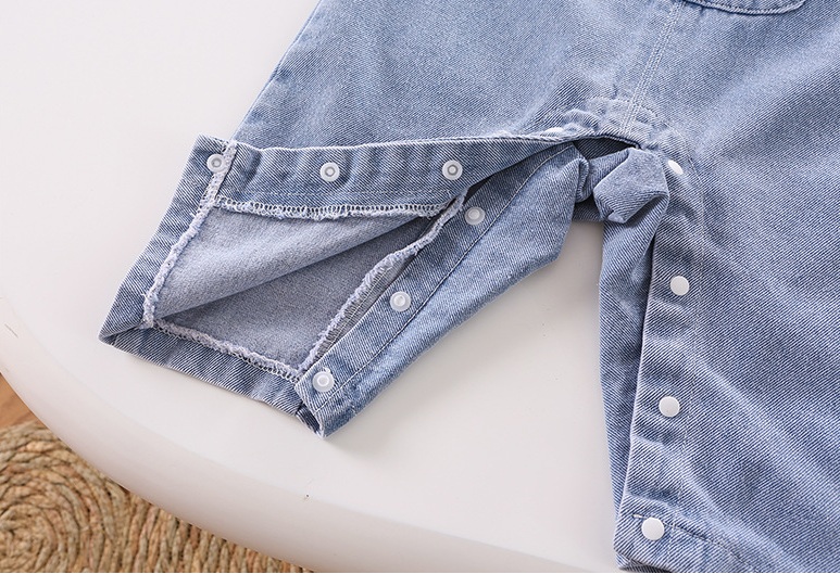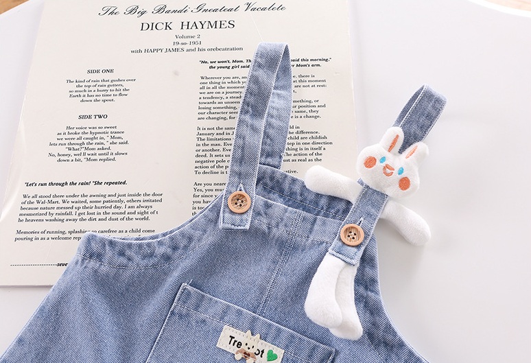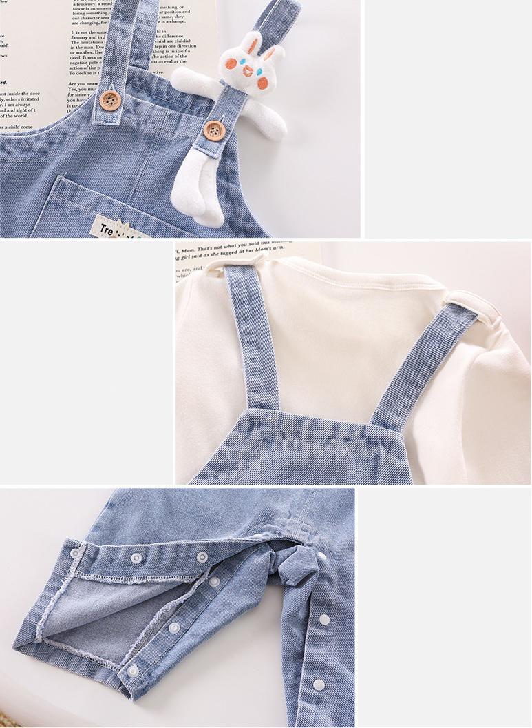 – Salopetă din denim – model confortabil, din material de blugi moale, cu bretele reglabile și buzunar frontal funcțional. Accentuul este pus pe detaliul 3D adorabil – un iepuraș din pluș, care adaugă un aspect jucăuș și fermecător. Închiderea practică cu capse la picioare facilitează îmbrăcarea și schimbarea.