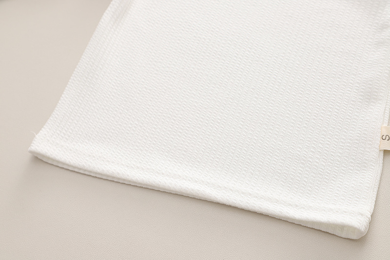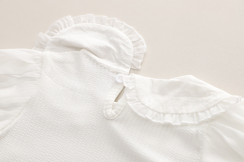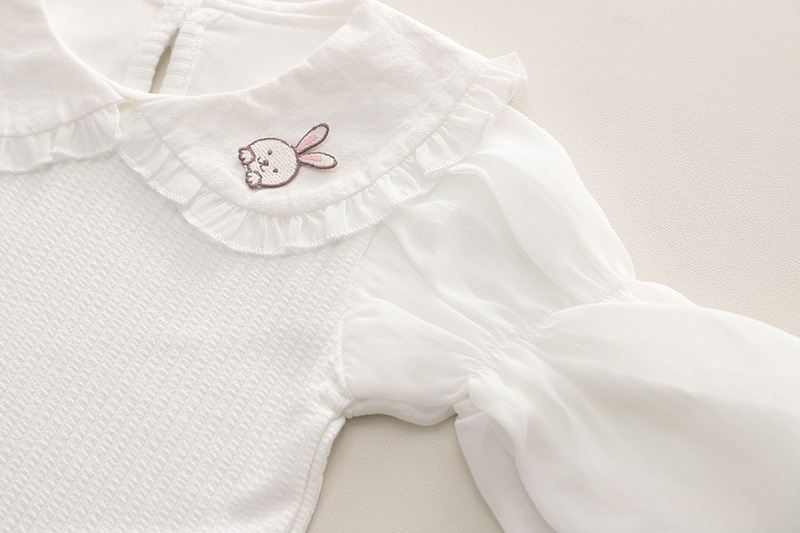 -Bluză albă din material moale, cu un guler mare și o emblemă cu iepuraș, un nasture la ceafă pentru îmbrăcare ușoară + mâneci extravagante cu adaos de organza pentru un aspect elegant.
