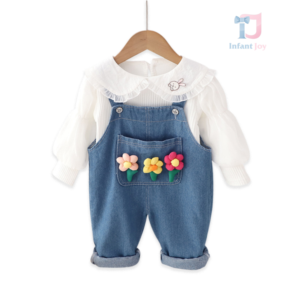 Set de 2 piese cu salopetă din denim, flori 3D și mânecă bufantă Flowerista Bunny