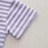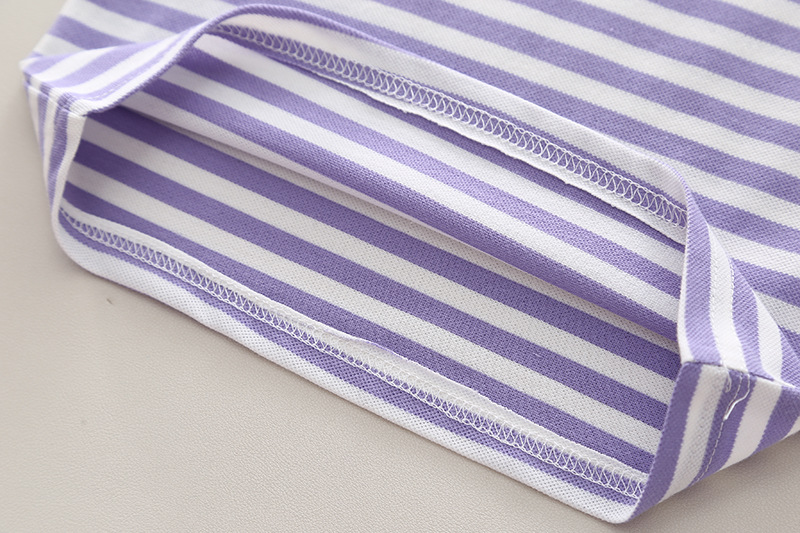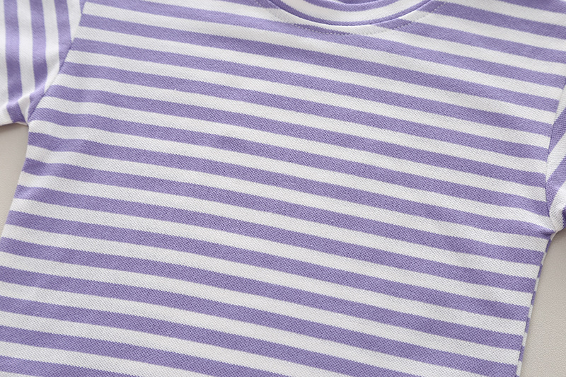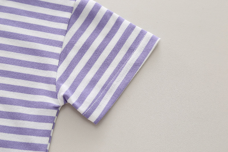 – Tricou din material tip „Lacoste“, alb cu dungi mov. Model cu croială clasică și decolteu rotund.