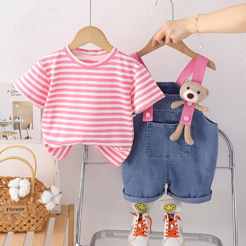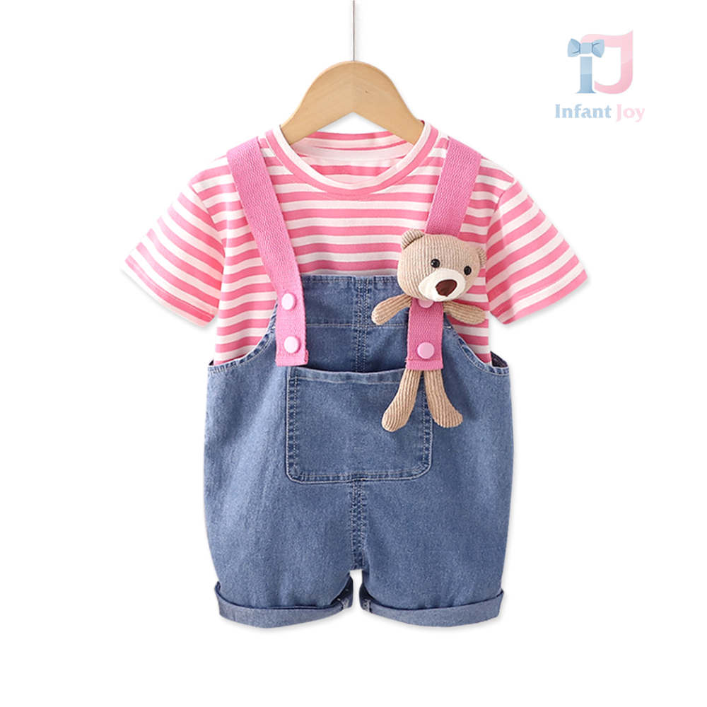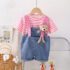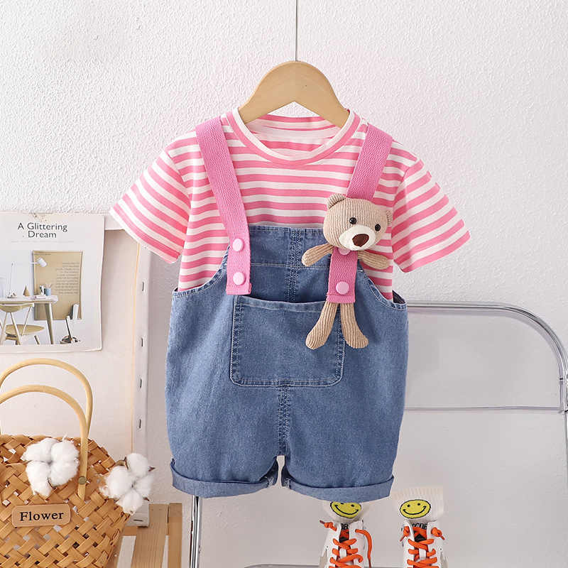 Set de 2 piese cu salopetă din denim și element 3D Bear Pinkish