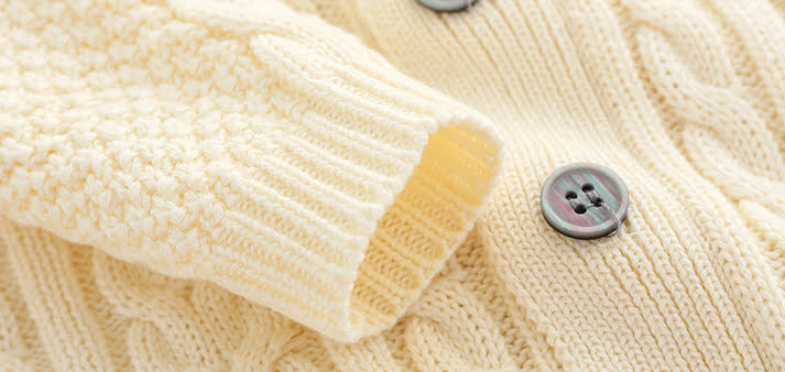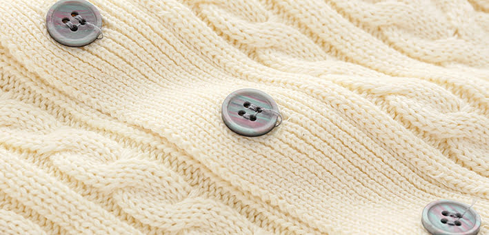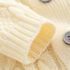 -Salopetă tricotată, de culoare bej deschis, cu modele artizanale diverse și un guler mare în formă de V. Închidere cu nasturi evidențiați, de culoare grafit, pe toată lungimea, pentru o îmbrăcare ușoară.