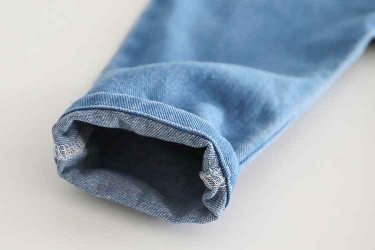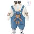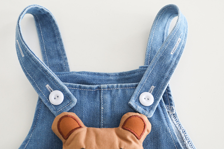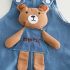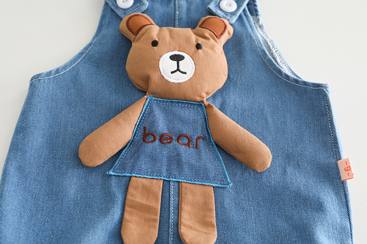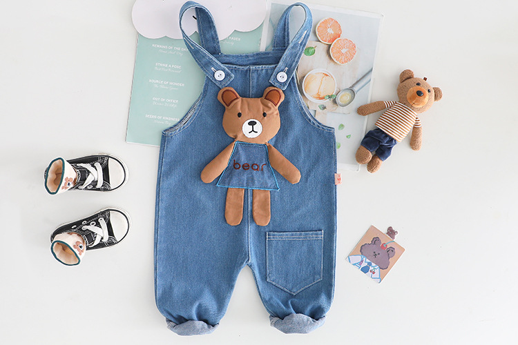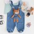 – Salopetă din denim cu bretele reglabile prin nasturi + un ursuleț 3D în buzunar și un buzunar suplimentar pe un crac.