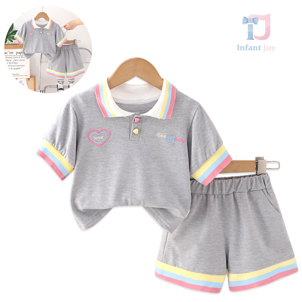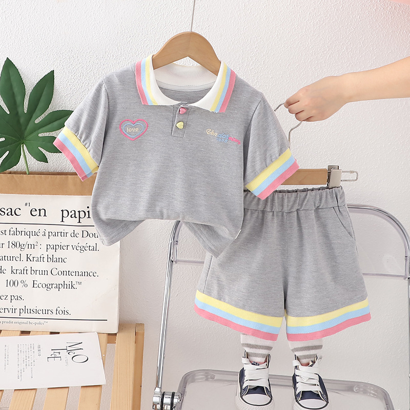 Set de 2 piese cu tivuri colorate, guler clasic și broderii Love Rainbow Grey