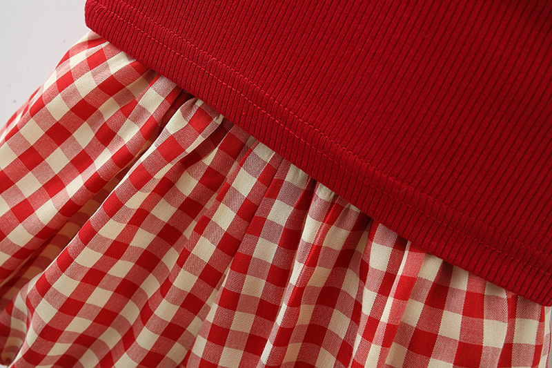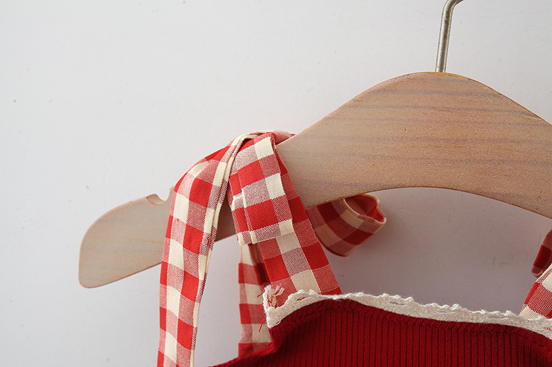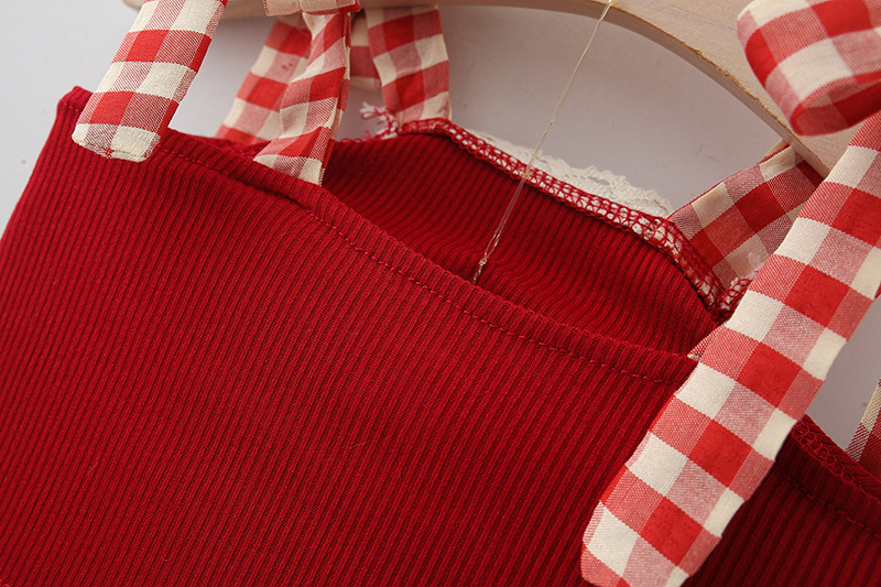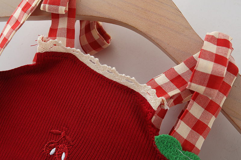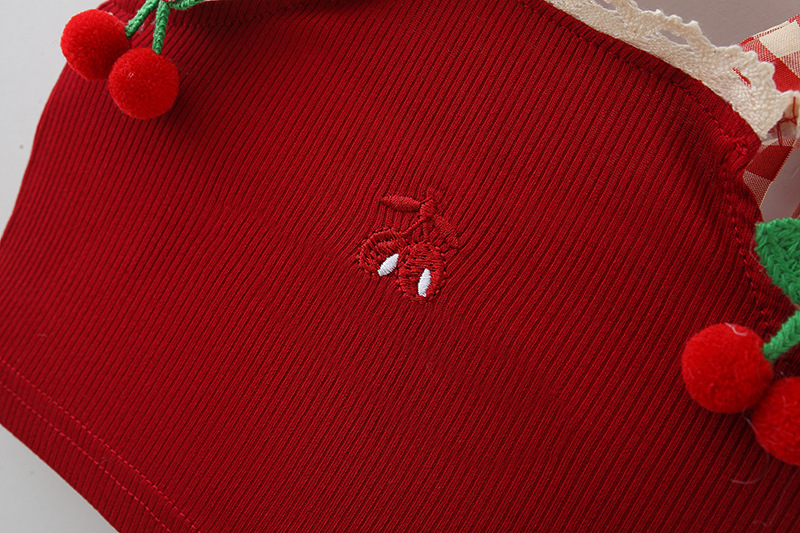 -Top tricotat din material ușor, în roșu intens, cu cireașă brodată și bordură din dantelă. Confecționat din material moale, cu nervuri. Marginea superioară este decorată cu dantelă fină din bumbac. Bretelele sunt accesorizate cu fundițe din material în carouri roșu și ecru, împodobite cu cireșe textile cu frunzulițe – efect 3D ce atrage imediat privirea.
