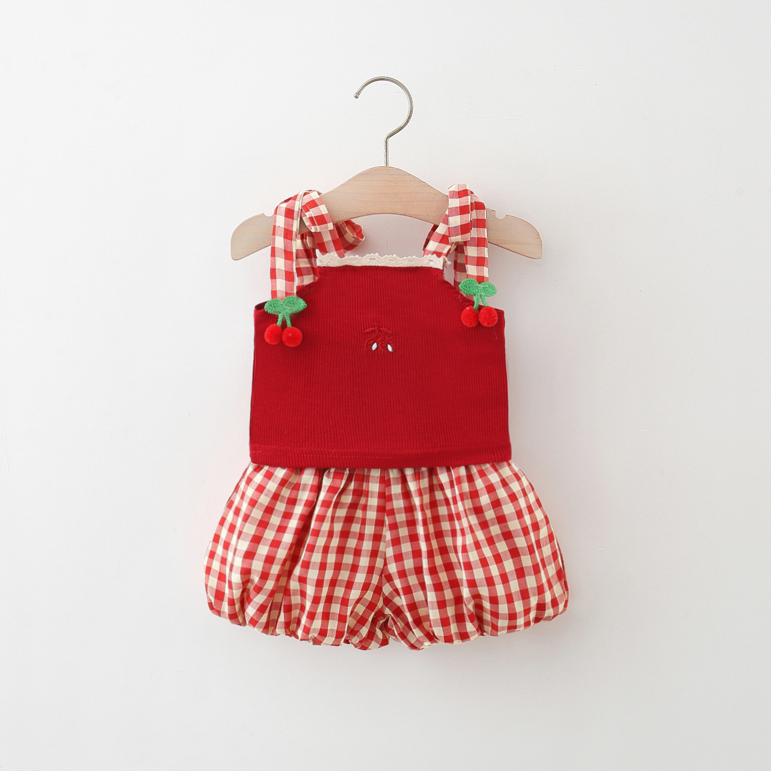Set de 2 piese cu top cu broderie, bordură din dantelă și bretele de efect și pantaloni scurți în carouri Cherry Cutie