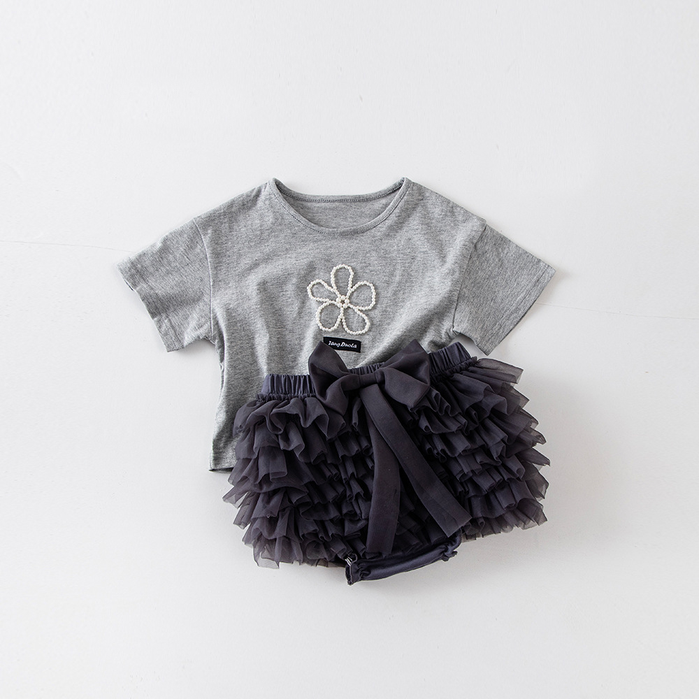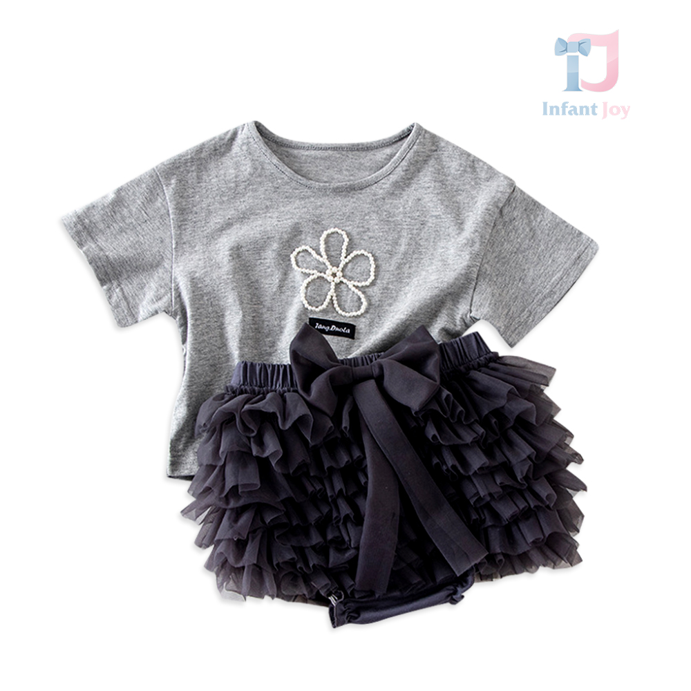 Set de 2 piese cu top cu margaretă din perle + fustă tutu închisă la culoare cu chiloței și fundiță Midnight Daisy