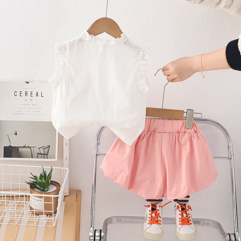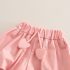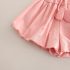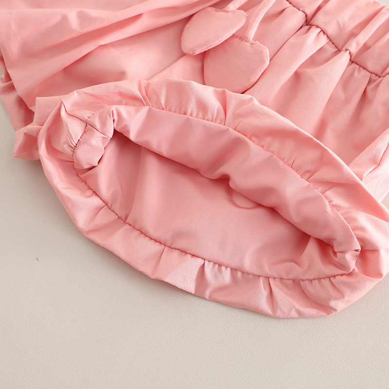-Pantaloni scurți tip „balon” în roz, cu fronseuri bogate și talie elastică. Șnururi decorative cusute, cu inimioare evidențiate.