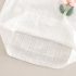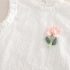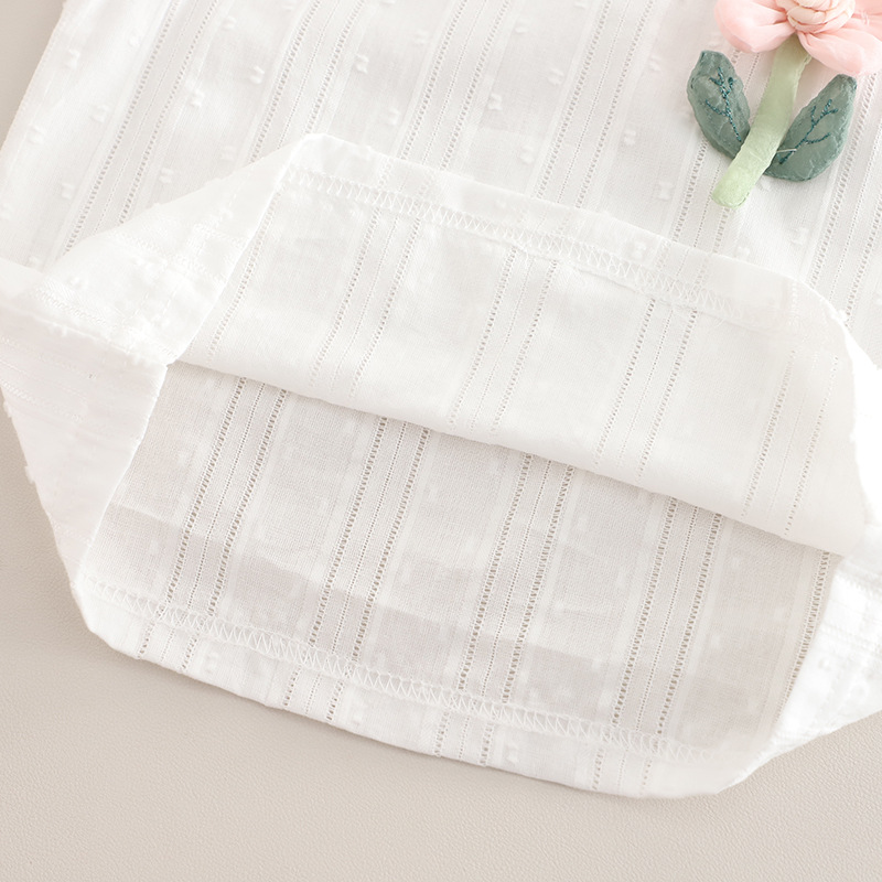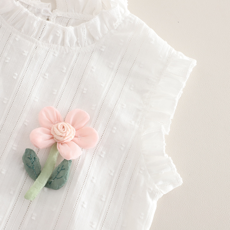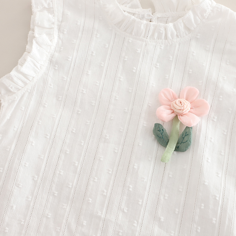 -Top alb, din material moale și respirabil din bumbac, decorat cu o textură fină de puncte brodate vertical. Umerii și gulerul sunt împodobiți cu volane care oferă un aspect romantic și ușor vintage. Accentul este o broșă textilă 3D cusută manual – o floare cu frunzulițe, ca detaliu distinctiv al modelului.