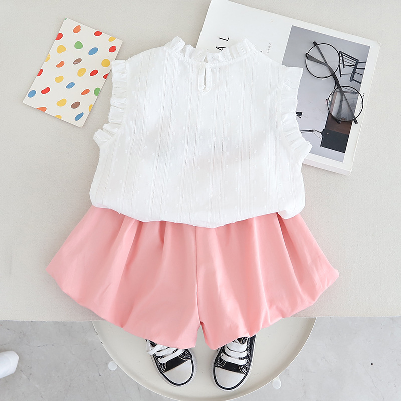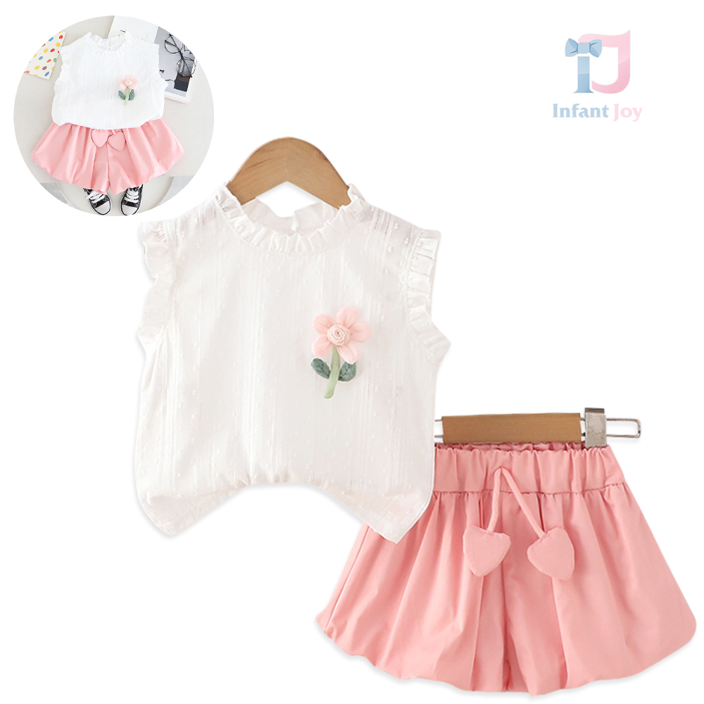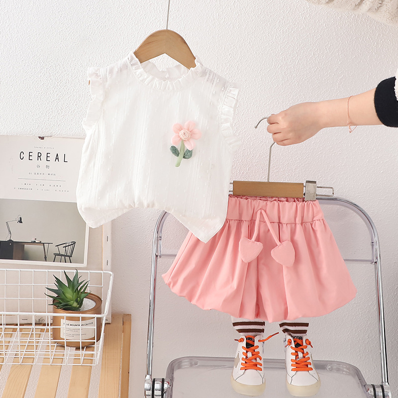 Set de 2 piese cu top cu volane, broșă 3D cu floare și pantaloni scurți tip fustă Pink Bloom