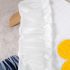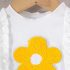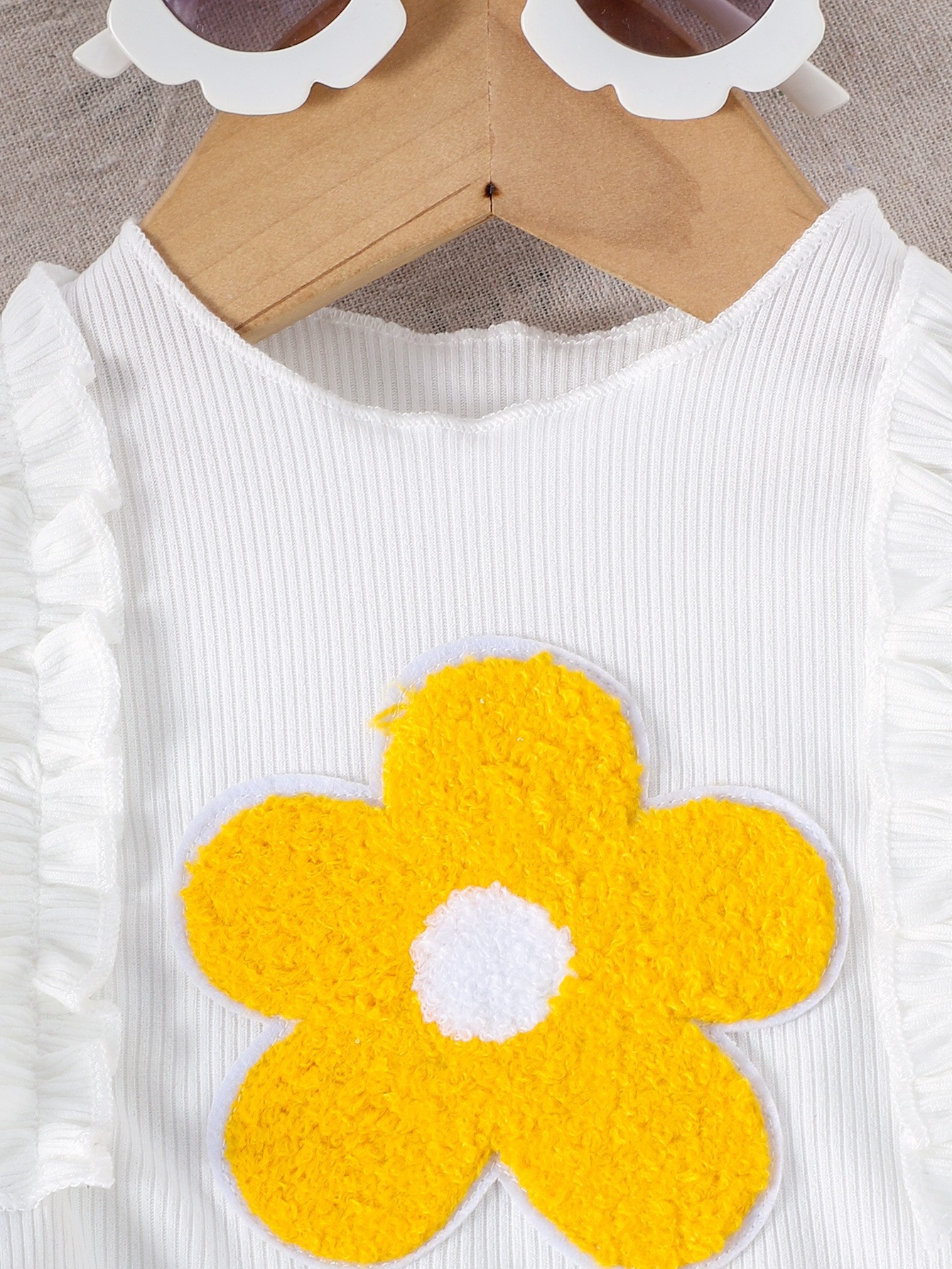 – Top alb, confecționat din material rib elastic și moale. Model fără mâneci, cu volane aplicate în partea din față pentru un aspect deosebit. Accesorizat cu o floare 3D în galben intens ca punct de atracție.