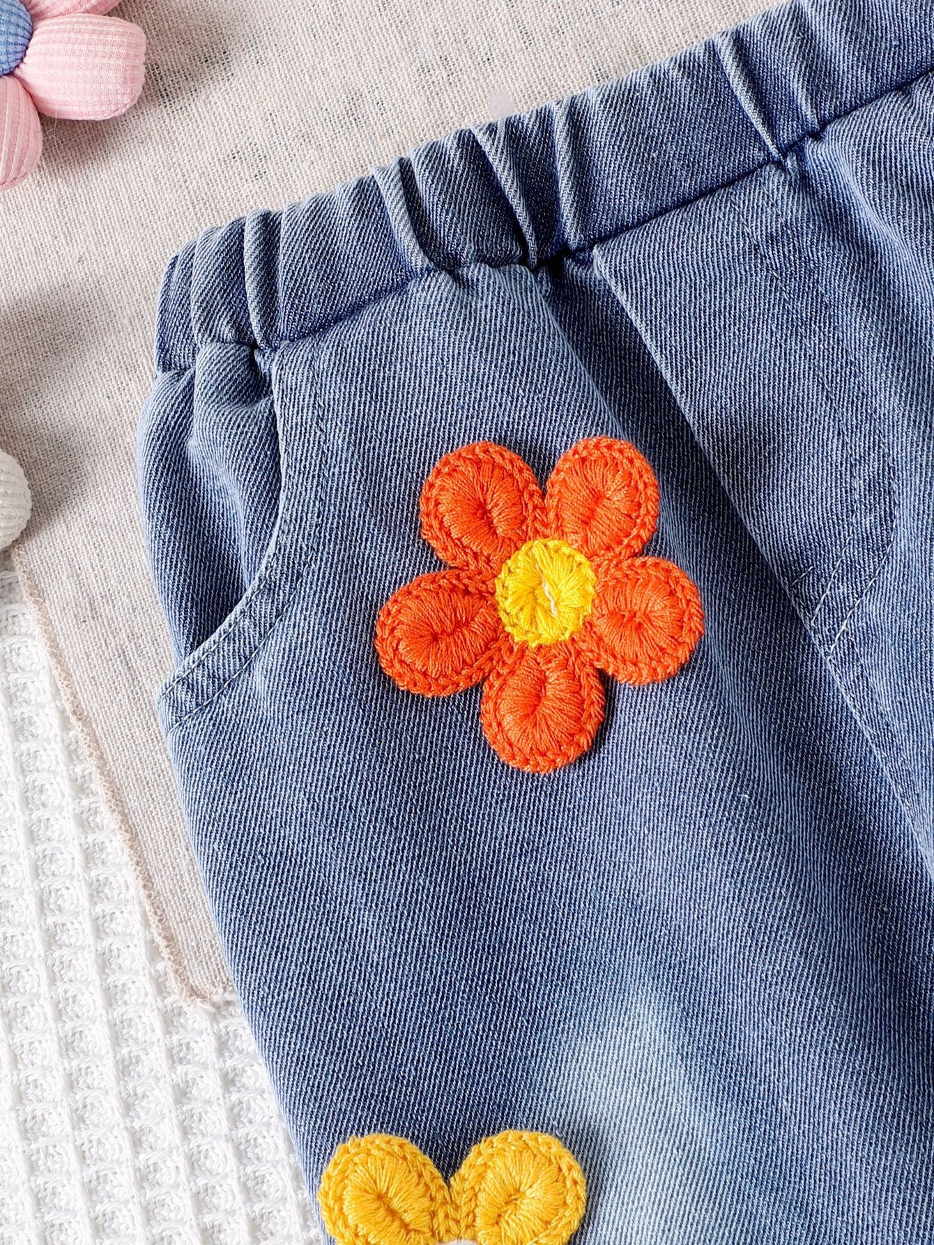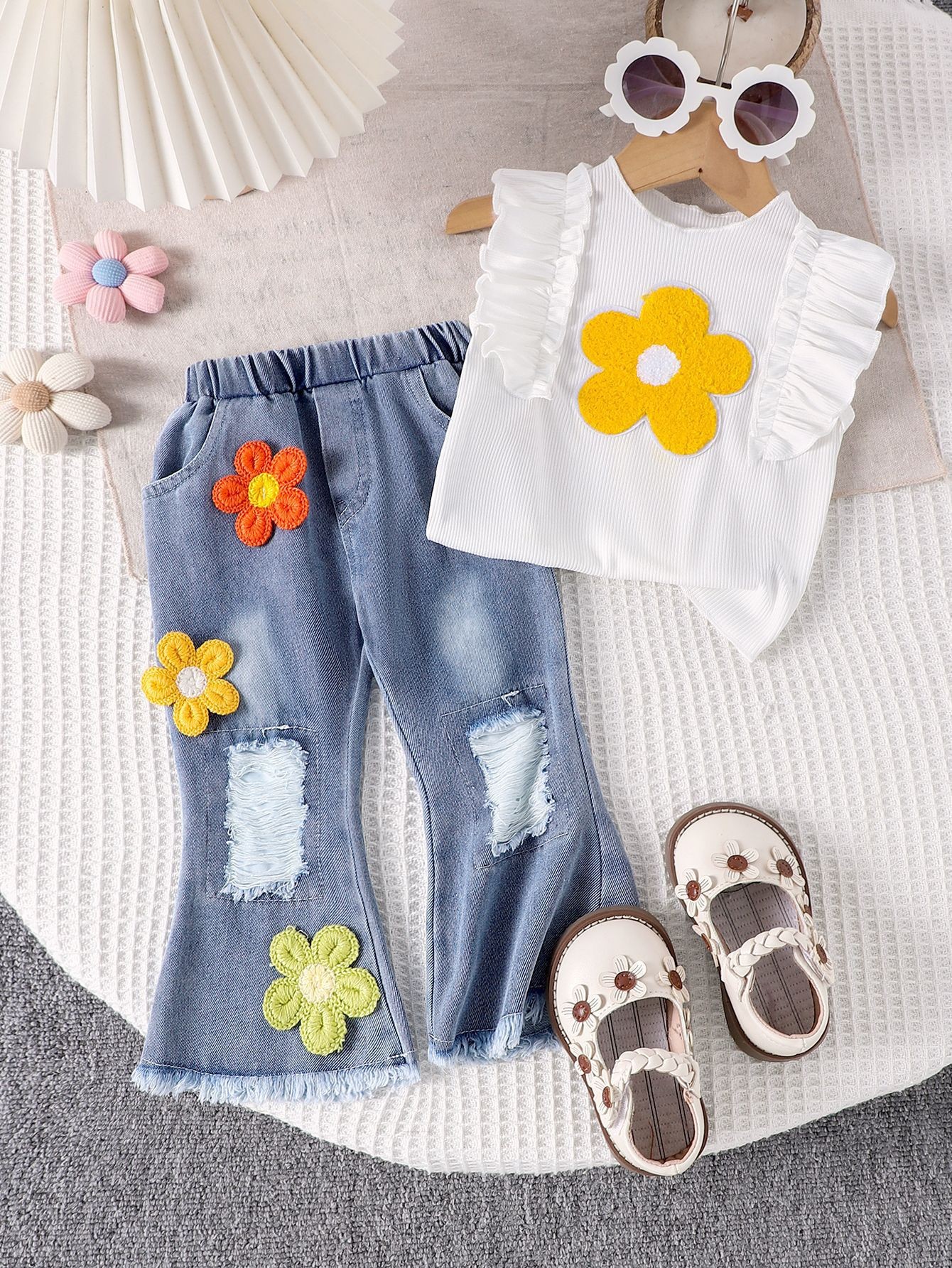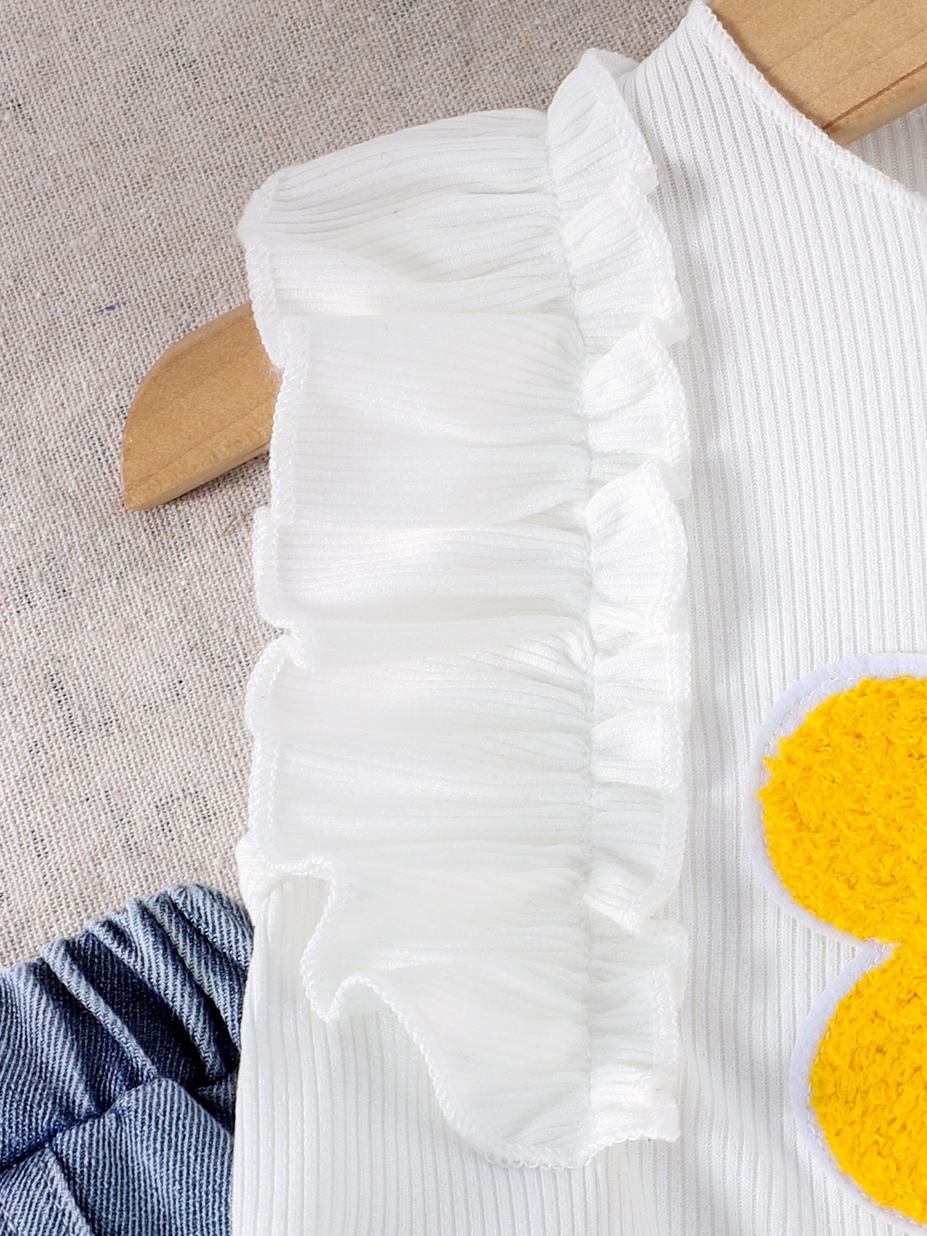 Set de 2 piese cu top cu volane, elemente 3D și pantaloni denim tip Charleston Flower Groove