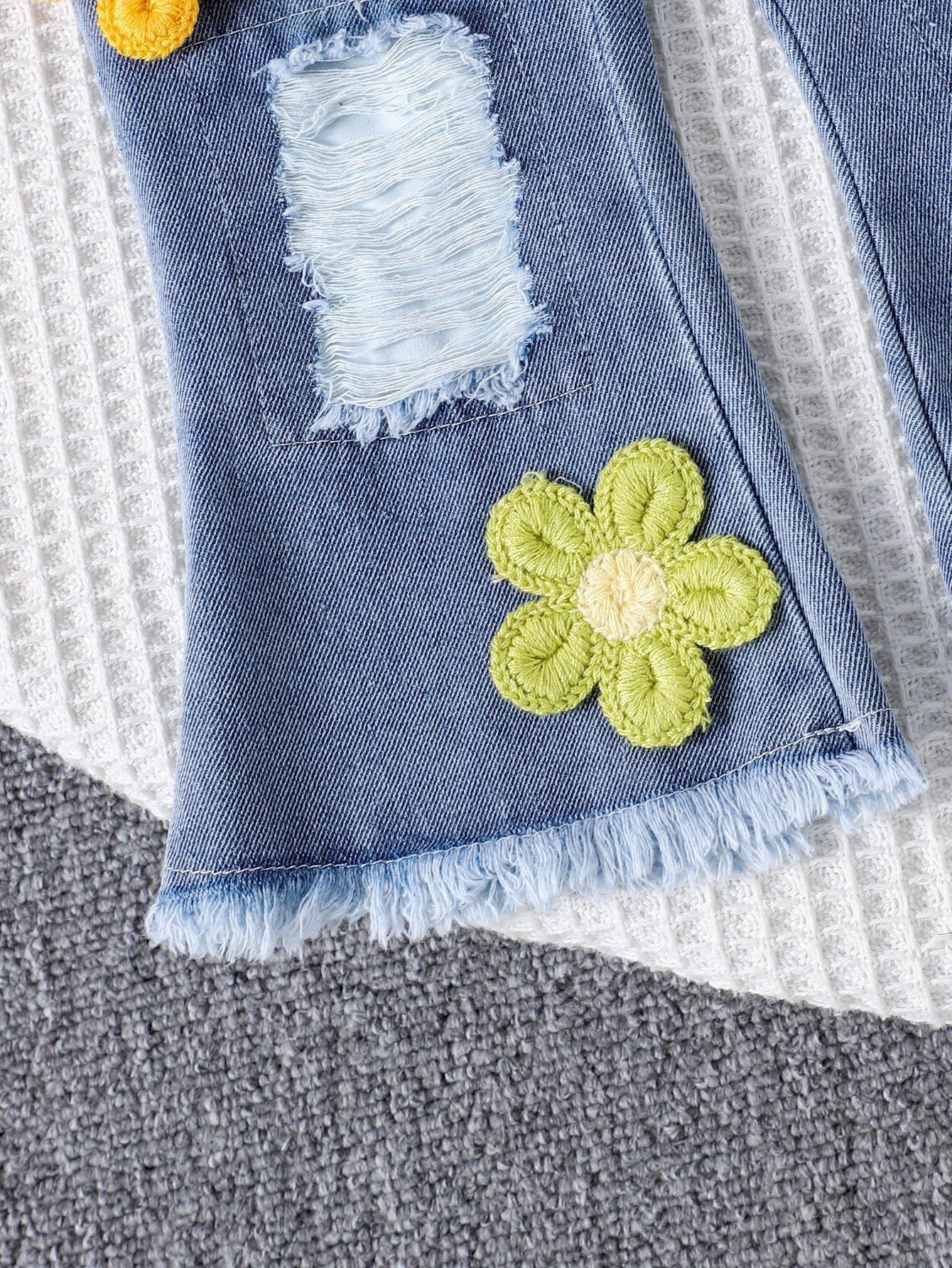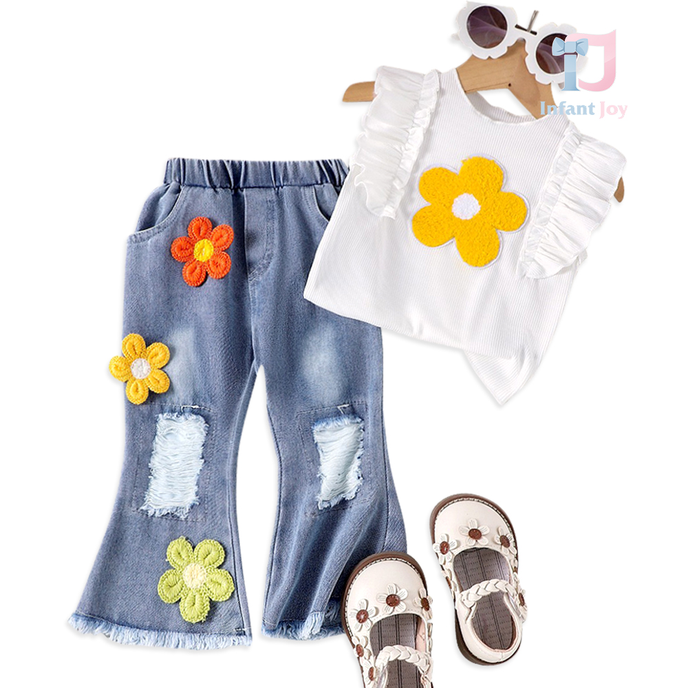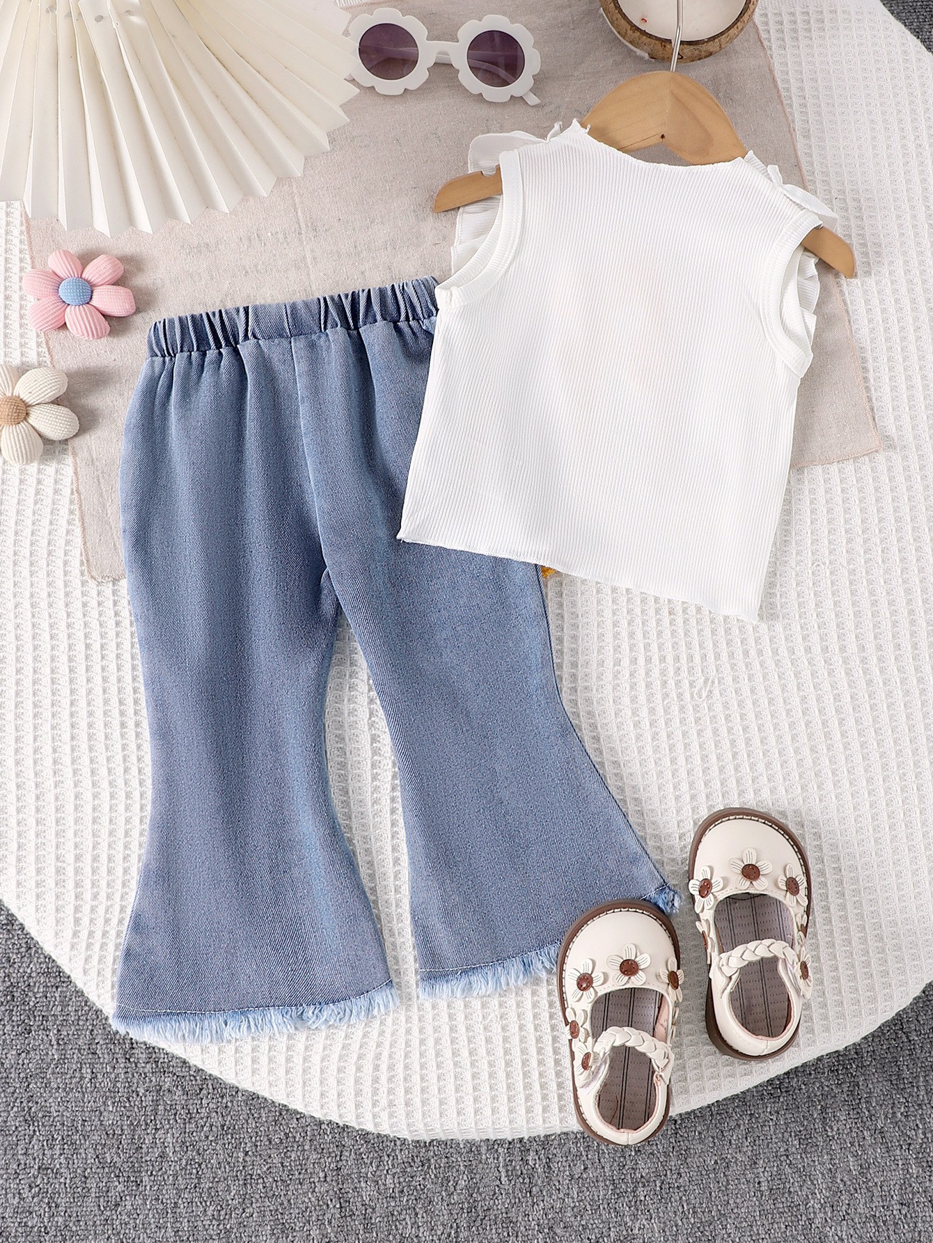 Set de 2 piese cu top cu volane, elemente 3D și pantaloni denim tip Charleston Flower Groove